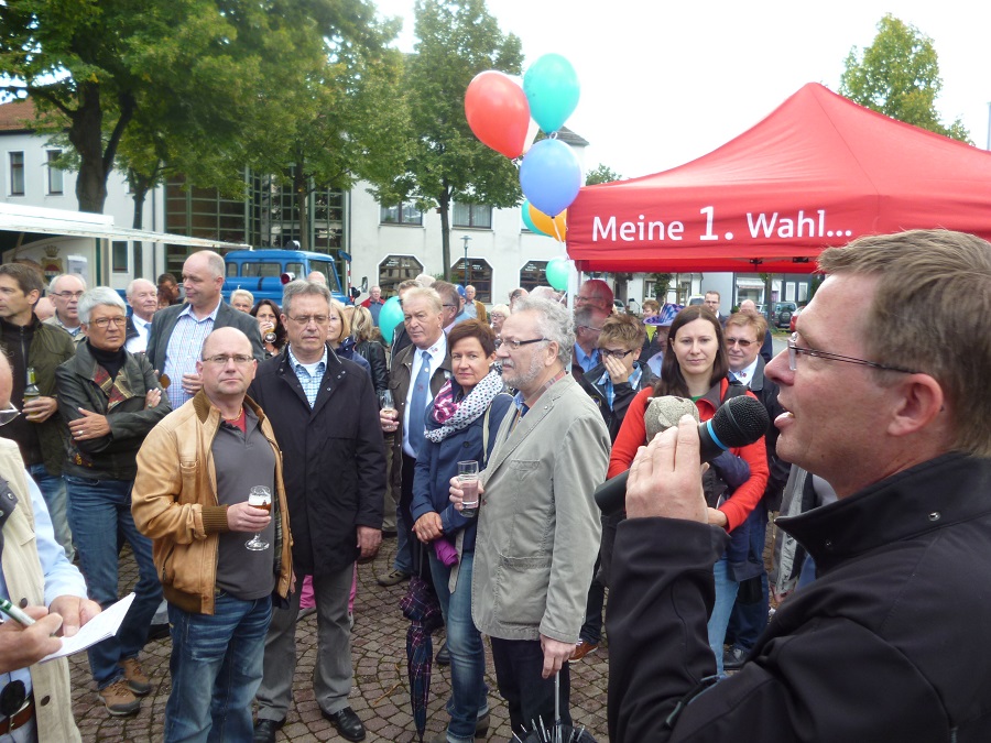Der schnelle Wechsel mit blauem Himmel und heftigem Regen bald im Minutentakt tat der Stimmung aber keinen Abbruch. Zahlreiche Schaulustige füllten den Hüstener Markt, darunter auch viele Politiker und Vertreter des öffentlichen Lebens. „Kirmes ist bei jedem Wetter“ verkündete Ingo Beckschäfer einen alten Slogan, doch für die fünf Kirmestage vom 12. bis 16. September wünscht er sich lieber einen goldenen Herbst.