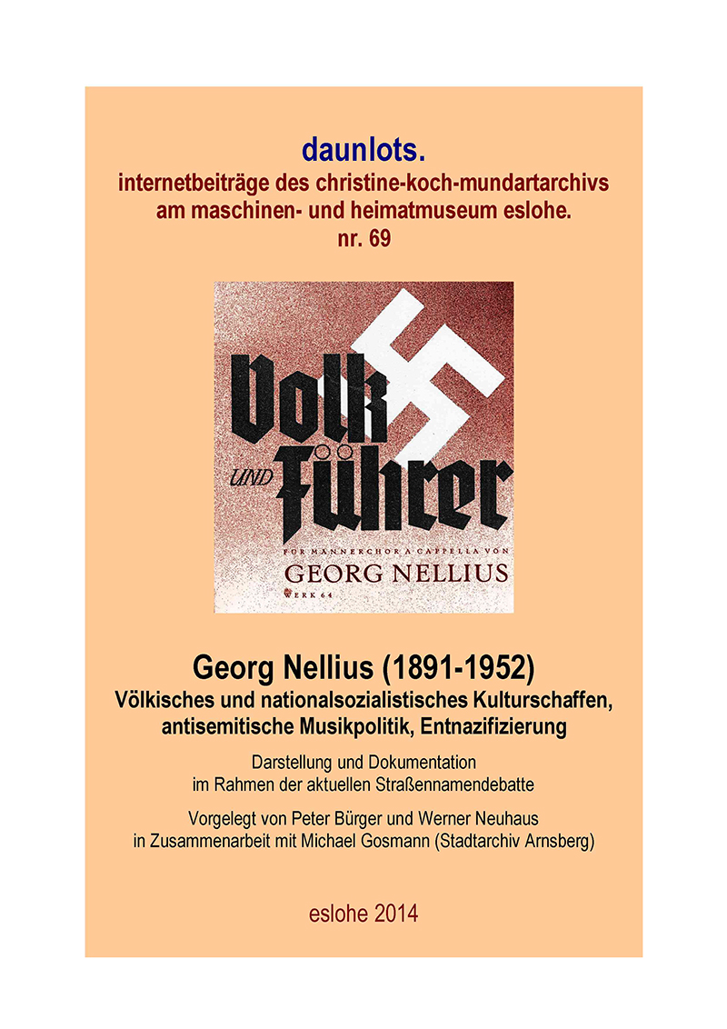 „Im Rahmen der aktuellen Straßennamendebatte haben Peter Bürger und Werner Neuhaus in Zusammenarbeit mit Michael Gosmann vom Stadtarchiv Arnsberg das nationalsozialistische Kulturschaffen von Georg Nellius minutiös untersucht. Die vorgelegte Forschungsarbeit bestätigt ein erschreckendes Bild antisemitischer Kulturpolitik. Dies ist der geistige Hintergrund, aus dem heraus die massenmörderische Judenverfolgung und Judenvernichtung des NS-Staates möglich wurde. Die Bürgerinitiative >Nelliusstraße bleibt Nelliusstraße< sollte gerade angesichts der neuen Forschungserkenntnisse den Hinweis von Heinrich Lübke bedenken, >dass Menschlichkeit aus der Verantwortung für die Vergangenheit erwächst. Deshalb erweist uns keiner von denen einen Dienst, die unserem Volk zureden, es müsse nun endlich einmal Schluss gemacht werden mit dieser Schattenbeschwörung aus den Tagen einer furchtbaren Vergangenheit. Nicht wir beschwören die Schatten, die Schatten beschwören uns, und es liegt nicht in unserer Macht, uns ihrem Bann zu entziehen<.“