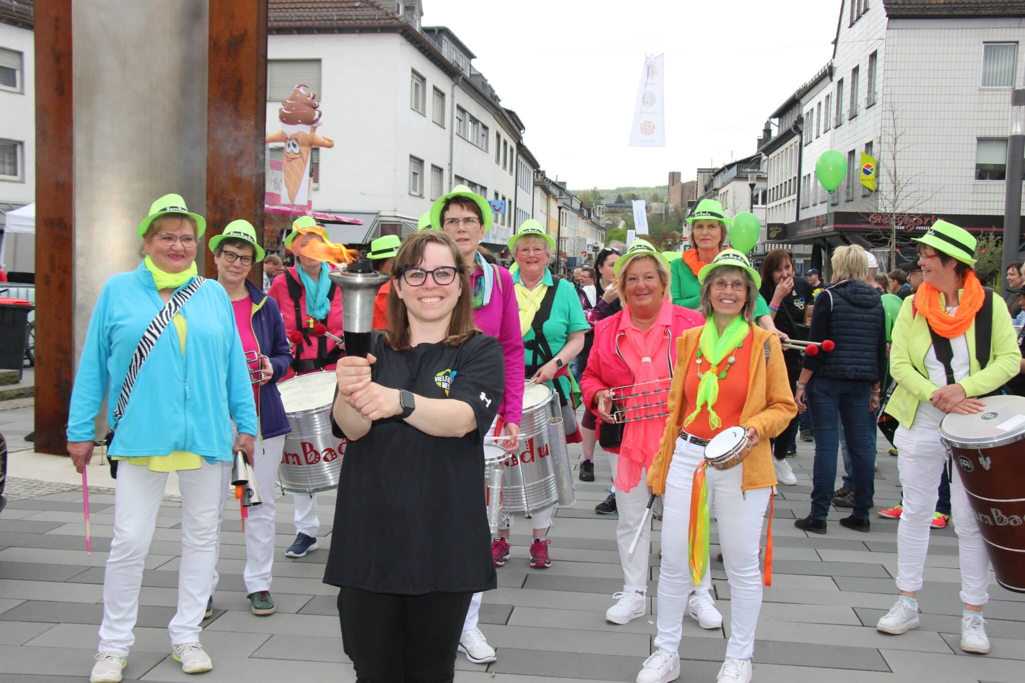 Der Einlauf der Gruppe in Meschede wurde von jubelnden Zuschauern begleitet, die die Läufer anfeuerten und ihnen Applaus spendeten. Die Stimmung wurde angeheizt durch die mitreißenden Rhythmen der Sambagruppe Sambadu. Fackelträgerin Stefanie Drescher, die bei den Special Olympics World Summer Games 2019 in Abu Dhabi zwei Medaillen gewann und bei den Special Olympics World Summer Games 2023 in Berlin antreten wird, führte die Gruppe bis in den Hennepark. Dort wurde das Feuer von Fanfaren der Musikschule HSK, den St- Georgs Schützen Meschede, Vertretern von Special Olympics NRW, dem Sozialwerk St. Georg und allen Besuchern von „Henne in Flammen“ gebührend empfangen.