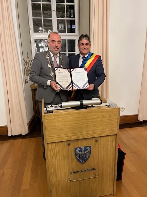 50 Jahre, ein halbes gemeinsames Jahrhundert, das seinen offiziellen Beginn nahm am 18. Mai 1974. Bereits im Jahr 1973 erfuhr die damalige Stadt Arnsberg, dass die Republik Rumänien an einer gemeinsamen Partnerschaft interessiert sei. Nach einigen Vorgesprächen und nötigen Vorbereitungsprozessen wurde der Grundstein für die bis heute stetig gewachsene Verbindung gelegt. Damals besuchte eine Delegation aus Arnsberg die Stadt Alba Iulia. „Der Beginn einer gemeinsamen Reise, von der damals vielleicht noch nicht jede und jeder gedacht hätte, dass sich diese zur längsten partnerschaftlichen Verbindung zwischen zwei Städten aus Deutschland und Rumänien seit dem Zweiten Weltkrieg entwickeln würde“, resümierte Bürgermeister Ralf Paul Bittner in seiner Rede an die Gäste.