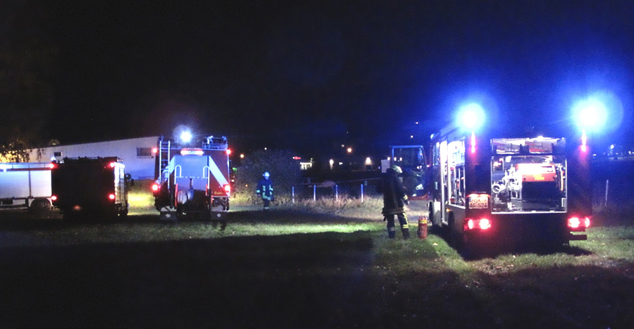 Die Zufahrt zum Segelflugplatz war für die zum Teil recht breiten Löschfahrzeuge stellenweise sehr beengt, so dass einige Großfahrzeuge vor der Zufahrt in Bereitstellung positioniert wurden. Die ersten Einsatzkräfte vor Ort stellten schnell fest, dass der gemeldete Feuerschein von einer brennenden Matratze herrührte, die unmittelbar neben einem im Freien abgestellten Segelflugzeuganhänger lag. Dieser wurde durch die Brandeinwirkung beschädigt. Die Einsatzkräfte hatten das Feuer mit dem Schnellangriffsschlauch binnen kurzer Zeit abgelöscht. Weitere Fahrzeuge leuchteten mit ihren Arbeitsscheinwerfern die in der Dunkelheit liegende Einsatzstelle aus. Der Einsatz war nach einer knappen halben Stunde beendet.