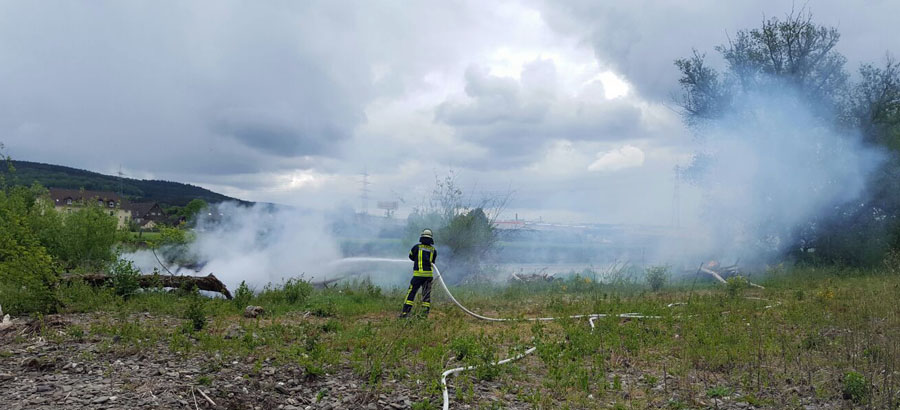 Da die Ein­satz­stel­le abseits jeg­li­cher Zuwe­gung lag und mit Feu­er­wehr­fahr­zeu­gen nicht unmit­tel­bar zu errei­chen war, muss­te die erfor­der­li­che Was­ser­ver­sor­gung zum Löschen der Brän­de über eine län­ge­re Stre­cke auf­ge­baut wer­den. Daher wur­de der Lösch­zug Hüs­ten zur Unter­stüt­zung ange­for­dert. Nach­dem die Ver­sor­gung mit dem benö­tig­ten Lösch­was­ser gesi­chert war, hat­ten die Wehr­leu­te die in Flam­men ste­hen­den Berei­che mit meh­re­ren C‑Rohren dann schnell abge­löscht. Die Brand­stel­len wur­den abschlie­ßend kon­trol­liert, und die Ein­satz­kräf­te konn­ten nach einer knap­pen Stun­de wie­der in ihre Stand­or­te einrücken.
