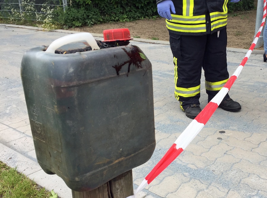 Zeitgleich wurde die dunkelfarbene Substanz mit Bindemittel abgestreut und dadurch aufgenommen. Bei der Suche fand die Feuerwehr auch einen nicht verschlossenen Kanister, aus dem die Substanz stammen könnte. Dem Behälter nach zu urteilen, könnte es sich um ein Holzschutzmittel gehandelt haben. Für den Abtransport des gebrauchten Bindemittels sowie des Kanisters wurde der städtische Bauhof gerufen, der mit zwei Mitarbeitern an dem Spielplatz im Einsatz war. Nach etwa einer Stunde war der Einsatz damit für die Feuerwehr beendet.