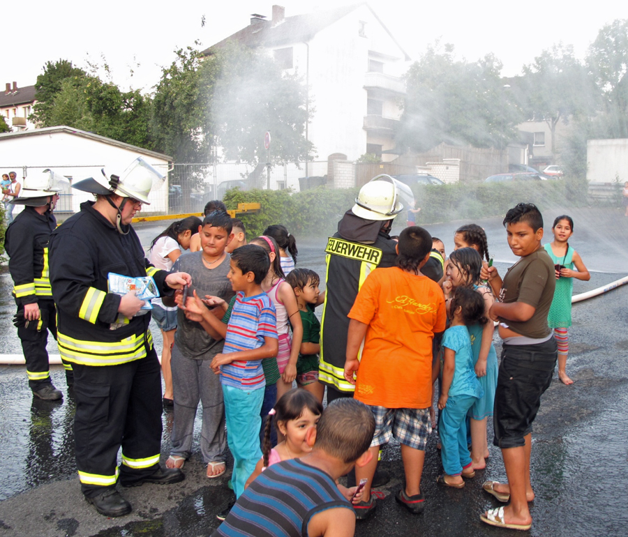 Und zum Abschluss hat­ten die Män­ner und Frau­en der Feu­er­wehr noch eine beson­de­re Über­ra­schung für die in der Asyl­un­ter­kunft leben­den Kin­der parat: Mit Hil­fe eines soge­nann­ten Hydro­schil­des erzeug­ten sie eine Was­ser­wand, durch die die Kin­der lau­fen und sich ange­sichts der hoch­som­mer­li­chen Tem­pe­ra­tu­ren erfri­schen konn­ten. Die­ses Ange­bot nah­men die Kin­der und Jugend­li­chen begeis­tert an. Zudem spen­dier­te der Basis­lösch­zug 1 den jun­gen Übungs­be­ob­ach­tern noch eine Run­de Was­ser-Eis, was ein dank­ba­res Lächeln auf die Gesich­ter der Klei­nen zau­ber­te. „So ver­ab­schie­de­ten sich die Ein­satz­kräf­te und die Asyl­su­chen­den in der Gewiss­heit von­ein­an­der, sich gegen­sei­tig ein Stück weit bes­ser ken­nen­ge­lernt und einen ganz rea­len Ein­blick in die Lebens­wirk­lich­keit des ande­ren gewon­nen zu haben,“ schließt Peter Krä­mer sei­nen Bericht.