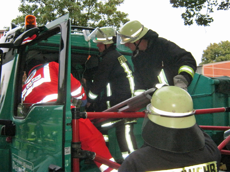 „Beim Ein­tref­fen der ers­ten Ein­satz­kräf­te waren bei­de Fah­rer in ihren Fahr­zeu­gen ein­ge­schlos­sen und konn­ten sich nicht sel­ber befrei­en. Sofort wur­den wei­te­re Kräf­te alar­miert und gleich­zei­tig mit der pati­en­ten­ori­en­tier­ten Ret­tung der Per­so­nen begon­nen,“ schil­dert Udo Schüt­te, Öffent­lich­keits­be­auf­trag­ter des BLZ 5, das Sze­na­rio. „Par­al­lel zu den Vor­be­rei­tun­gen der Ret­tungs­maß­nah­men wur­de der Brand­schutz durch die Bereit­stel­lung meh­re­rer Lösch­mit­tel sicher­ge­stellt. Zur Ret­tung des Pkw-Fah­rers muss­te zunächst die Fah­rer­tür von der Feu­er­wehr mit hydrau­li­schem Ret­tungs­ge­rät ent­fernt wer­den. Danach konn­ten die Ret­tungs­kräf­te des DRK den Ver­letz­ten behan­deln und für den Abtrans­port sta­bi­li­sie­ren. Zeit­gleich wur­de mit Hil­fe einer Ret­tungs­platt­form der Fah­rer des Lkws medi­zi­nisch behan­delt und betreut. Anschlie­ßend wur­de er gemein­sam durch Kräf­te von Feu­er­wehr und DRK mit Hil­fe einer Schau­fel­tra­ge aus sei­ner miss­li­chen Lage gerettet.“