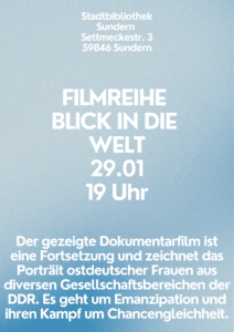 Sundern. „Blick in die Welt“ ist eine ehrenamtlich organisierte Filmreihe, die im Juni in der Stadtbibliothek Sundern Premiere gefeiert hat und an jedem letzten Donnerstag im Monat stattfindet. Ziel der Reihe ist es, den Blick für das zu schärfen, was uns umgibt: die Welt – sei es in der Ferne oder im unmittelbaren Alltag.