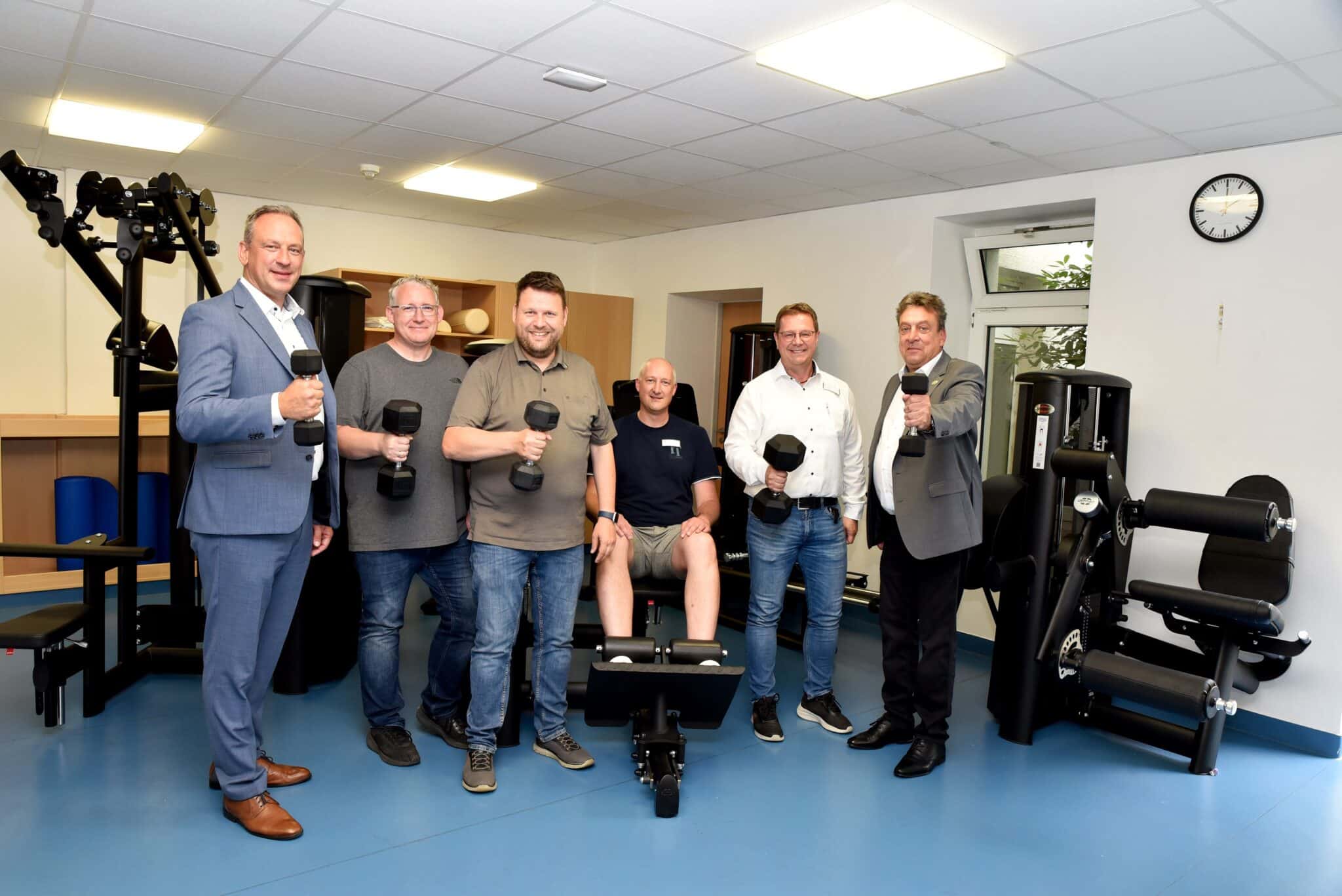 Zur offiziellen Übergabe des Fitnessraums durch den Förderverein an das Klinikum Hochsauerland machten sich jetzt Geschäftsführer Michael Gesenhues zusammen mit Standortleiter Peter Eickeler und dem Bereichsleiter Therapie, Harald Brackhagen, sowie dem Vorsitzenden des Fördervereins Ulrich Mönke und seinen Vorstandskollegen Frank Bornemann und Alexander Huckschlag ein eigenes Bild von der Investition und den damit verbundenen hervorragenden Trainingsmöglichkeiten im Haus. Harald Brackhagen, Physiotherapeut und Bereichsleiter Therapie am Klinikum Hochsauerland, stellte die Möglichkeiten vor und erläuterte, dass das Angebot geeignet ist, mehr als nur die Rückenmuskulatur zu stärken. Auf dem Laufband oder am Crosstrainer könne jeder und jede beispielsweise auch etwas für die persönliche Ausdauer tun. „Begleitende sportliche Angebote können bei bestimmten Erkrankungen eine positive Wirkung entfalten“, erklärt Brackhagen. Daher sei der Fitnessraum vormittags zu genau diesen Zwecken den Patientinnen und Patienten vorbehalten. Zu allen anderen Zeiten können die Beschäftigten hier etwas für ihre Gesundheit tun.