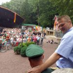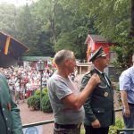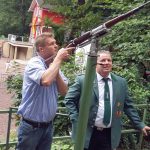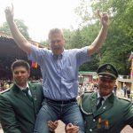 „Macht fer­tig, wir wol­len auf den Hof!“, hall­te es aus dem Publi­kum auf der Frei­licht­büh­ne, als es auf 11 Uhr zuging. Doch es waren 188 Schuss nötig, um der Krä­he den Gar­aus zu machen. Er habe im letz­ten Jahr schon ein wenig geschos­sen, aber wenig getrof­fen, dies­mal sei es bes­ser gelau­fen, sag­te der freu­de­strah­len­de neue König, den sei­ne eben­so strah­len­de Köni­gin mit dem Satz „Bist Du ver­rückt gewor­den?“ gratulierte.