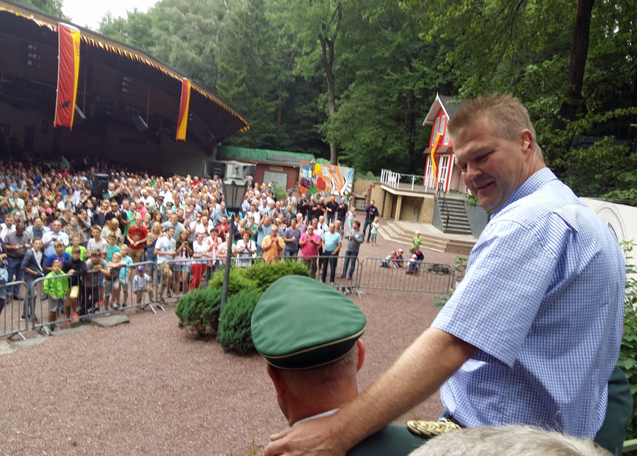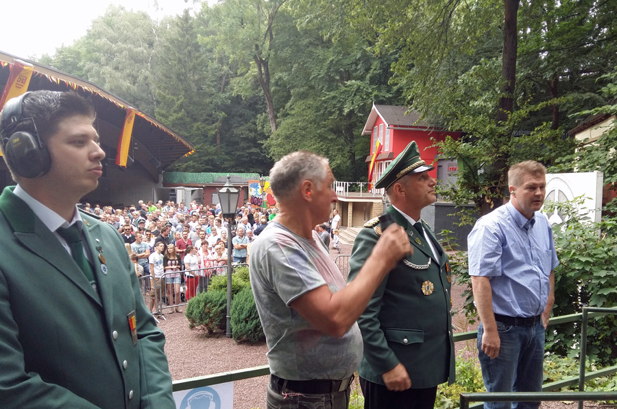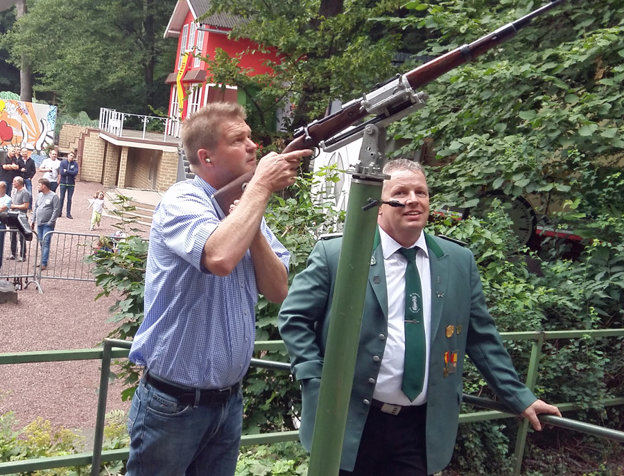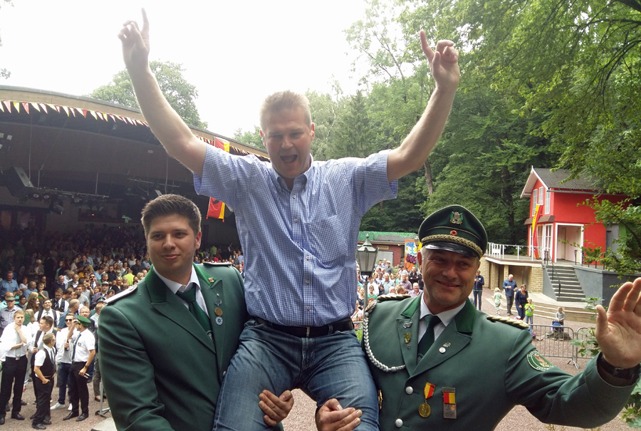 „Macht fer­tig, wir wol­len auf den Hof!“, hall­te es aus dem Publi­kum auf der Frei­licht­büh­ne, als es auf 11 Uhr zuging. Doch es waren 188 Schuss nötig, um der Krä­he den Gar­aus zu machen. Er habe im letz­ten Jahr schon ein wenig geschos­sen, aber wenig getrof­fen, dies­mal sei es bes­ser gelau­fen, sag­te der freu­de­strah­len­de neue König, den sei­ne eben­so strah­len­de Köni­gin mit dem Satz „Bist Du ver­rückt gewor­den?“ gratulierte.