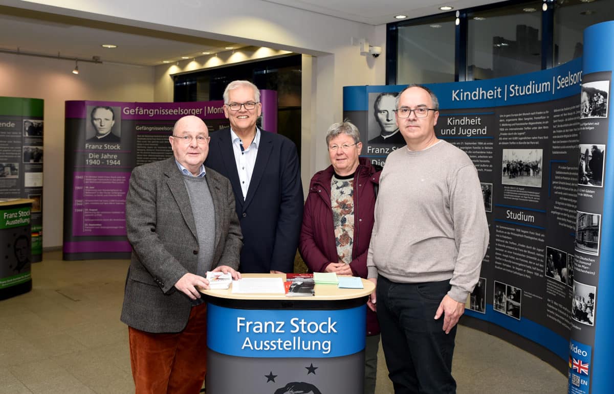 Franz Stock wurde 1904 in Arnsberg-Neheim geboren und vor allem durch die Wirren des 1. Weltkrieges beeinflusst und geprägt. Neben seinem Anliegen, sich auch religiös in der deutschen Gesellschaft zu betätigen, gehörte vor allem die Völkerverständigung zu seinen wichtigen Aufgaben. Nach Studienaufenthalten und Reisen nach Frankreich wurde er 1934 zum Pfarrer der deutschsprachigen Gemeinde Paris bestellt. Von hier aus wirkte Franz Stock nur wenig später auch als Seelsorger der Gefängnisse von Paris, eine Aufgabe, die ihm den Titel des Gefangenenpriesters einbrachte. Bereits gesundheitlich angeschlagen, übernahm er 1945 zum Ende des Krieges die Aufgabe, im Kriegsgefangenenlager „Le Coudray“ bei Chartres die Aufgabe, hier gefangen genommene deutsche Priester und Seminaristen zusammen zu führen. Sein „Stacheldrahtseminar“ ist in die Geschichte eingegangen.