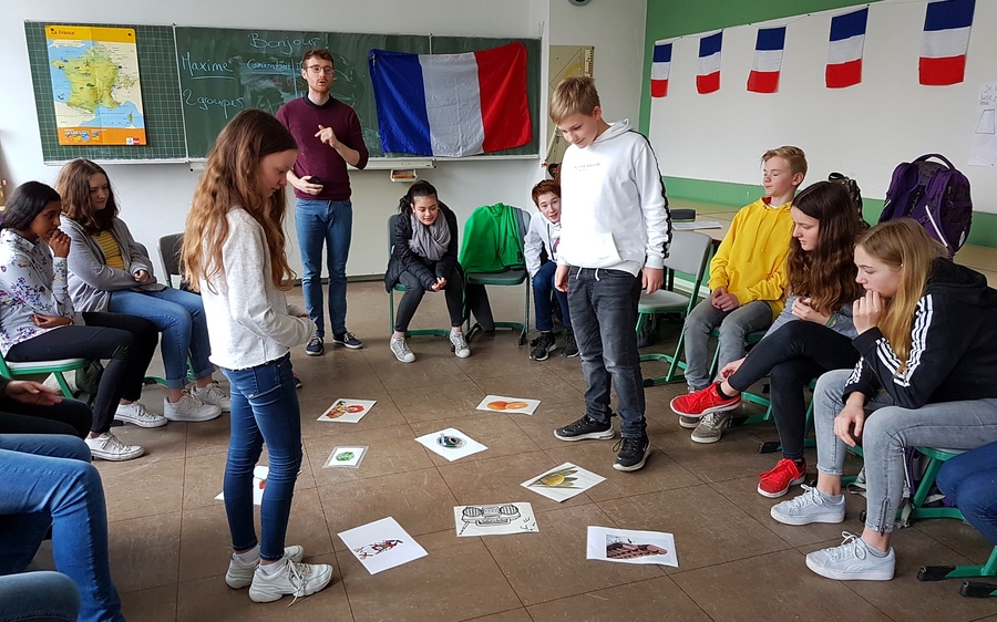 Von einer kleinen Vorstellungsrunde mit Zufallsfaktor über bildgestützte Vokabelspiele, bis hin zu aktuellen französischen Rapsongs – Monsieur Ruelleu hat alle Register gezogen, um seine Sprache und Kultur sowie die kleinen, aber feinen Unterschieden der beiden Partnerländer Frankreich und Deutschland den Schüler*innen schmackhaft zu machen. Darüber hinaus berichtete er auch von seinen persönlichen Erfahrungen, die er in den beiden Ländern gesammelt hat, und warb mit einer guten Portion Humor für seine Heimat, die Bretagne. Alle Schüler*innen waren voll bei der Sache und mussten aktiv werden, um spätestens beim abschließenden Gruppenwettbewerb „Wo-ist-was? Frankreich oder Deutschland?“ mit Spaß am Spiel zu siegen.