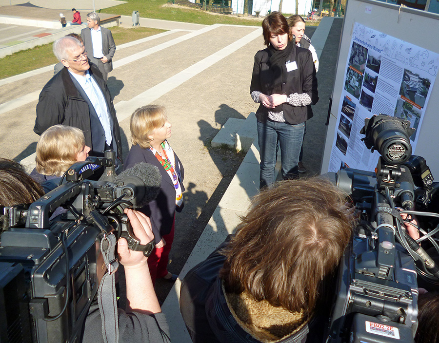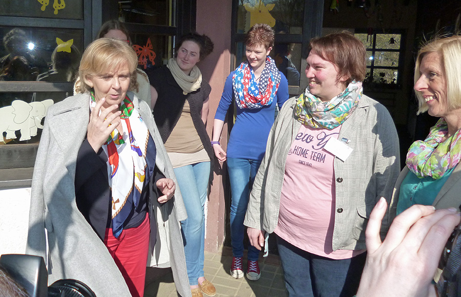 Wenige Schritte weiter überreichten ihr Kinder der Grundschule ihre Zeitung, die „Wackel-Zappel-News“. Hannelore Kraft versprach, sie anschließend während der Autofahrt zu lesen, da habe sie viel Zeit. Als sie erfuhr, dass die Gruppe das Kinderparlament von Moosfelde ist, sagte sie „Aha, Kollegen von mir!“ und fragte, wer den später mal in den Landtag wolle. Zaghaft hoben sich einige Hände. Kraft lud das komplette Kinderparlament zu einem Landtagsbesuch nach Düsseldorf ein und kam damit einem Wunsch zuvor, den die Kinder vorbringen wollten. Dann gab es noch ein Interview mit einer mutigen jungen Reporterin. „Ich habe mal nachschauen wollen, ob hier alles gut läuft“, sagte die Ministerpräsidentin, fragte die Kinder, ob sie den alle klar kommen, und sagte, dass sie es total schön hier finde, weil ganz viele Leute hier ganz viel geleistet hätten. Und dass sie es gut fände, wenn die Kinder sich später einmal auch so für andere Leute einsetzen würden. Danach musste sich Hannelore Kraft die blaue Kappe des Arche Noah-Kindergartens aufsetzen und mit ganz vielen Kindern für ein Gruppenfoto posieren. „Ich habe halt einen Dickkopf,“ erklärte sie den Kindern, als sie die Lasche der Kappe etwas größer stellen musste.