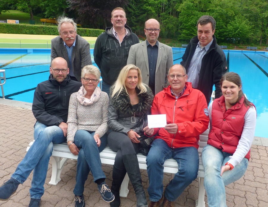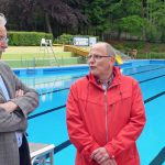 Die Schlagerparty sei zusammen mit der Raststation am Vatertag eine Haupteinnahmequelle des Fördervereins, sagt er Vorsitzende. Am Vatertag sei es in diesem Jahr wieder rappelvoll gewesen, doch bei solchen großen Veranstaltungen habe der Förderverein inzwischen die Grenzen seiner Leistungsfähigkeit erreicht. „Wir sind eine feste Truppe von nur um die zehn Leuten, von denen ich mit meinen 62 wohl der jüngste bin,“ sagt Gisbert Pohl. Eine Truppe, die in diesem Jahr seit Mitte Februar im Einsatz ist und sich nächstes Jahr noch mehr ranhalten muss, weil dann Pfingsten noch eine Woche früher liegt. „Einfach unglaublich, was diese Truppe leistet,“ findet auch Siegfried Rump, der Leiter des städtischen Sportbüros. „Die arbeiten jeden Tag von halb acht bis vier, dazu gehört was. Ohne den Förderverein würde die Stadt das Freibad nicht mehr einsatzbereit bekommen, dafür gibt es nicht mehr genug Personal.“ Gisbert Pohl gibt ein Teil des Lobs aber sofort weiter. Neben den ständigen Helfern gebe es auch andere tatkräftige Unterstützer, etwa die Jugendkompanie des Jägervereins oder die Handballer des TVN. Auch die Zusammenarbeit mit der neuen Lenkungsgruppe lobt der Vorsitzende des Fördervereins. Sie mache vieles einfacher, was früher nur über viele Umwege zu schaffen gewesen sei. De Gute Zusammenarbeit soll in Kürze auch an den drei Fahnenmasten abzulesen sein. Dort sollen die Fahnen der Stadt Arnsberg, des Aktiven neheim und des Freibad-Födervereins nebeneinander wehen. Die Fahne des Fördervereins wird derzeit noch von Dorothea Benke gestaltet.