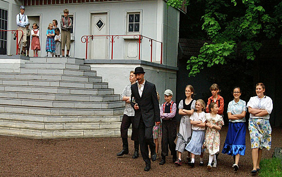 Alle Kin­der set­zen ihre Rol­len her­vor­ra­gend um, so dass der Zuschau­er glau­ben könn­te, es wären Sze­nen aus dem all­täg­li­chen Leben. Jonas Baltrusch, also Emil, ist ein Laus­bub wie es im Buche steht – und das nicht nur auf der Büh­ne. Eines der Kin­der läuft mit Toma­hawk her­um und spricht nur „india­nisch“ und kur­zer­hand wird der Rol­ler zum wil­den Mus­tang. Eine rich­tig klas­se Situa­ti­on ist auch, wenn die Kin­der ver­su­chen den Dieb in die Enge zu trei­ben. Die 60 Kin­der im Alter von zwei bis 16 Jah­ren bil­den eine Men­schen­mau­er und trei­ben den Dieb vor sich her.