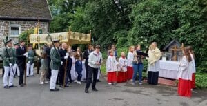 Sundern/Westenfeld. Am 30. Mai fand die mittlerweile traditionelle Fronleichnamsprozession im Alten Testament, diesmal in Westenfeld, statt. Das Festhochamt wurde von Pastor Klaman zelebriert. Anschließend zogen die Gläubigen hinter der von Diakon Levermann getragenen Monstranz mit dem Allerheiligsten unter Gebet und Gesang durch das Dorf.