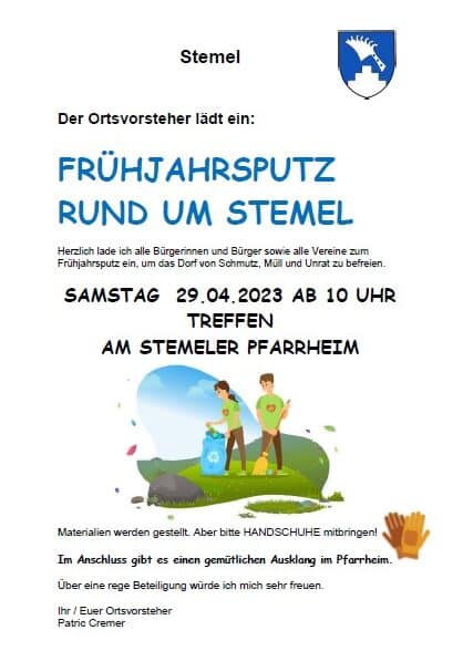 Sundern/Stemel. Stemels Ortsvorsteher Patric Cremer lädt alle Bürgerinnen und Bürger sowie die örtlichen Vereine zu einem „Frühjahrsputz“ ein, um das Dorf von Schmutz, Müll und Unrat zu befreien. Die Helferinnen und Helfer treffen sich um 10.00 Uhr am Pfarrheim (Stemeler Str. 42a). Nach getaner Arbeit steht für die Helferinnen und Helfer ein kleiner Imbiss bereit. Müllsäcke werden von den Technischen Diensten der Stadt gestellt. Geeignete Handschuhe bringt bitte jeder selber mit.