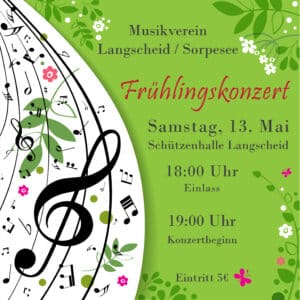 Sundern/Langscheid. Zum ersten Konzert seit der Corona-Pandemie lädt der Musikverein Langscheid alle Musikfreunde am 13.05.2023 in die Schützenhalle Langscheid ein. Der Konzertvortrag beginnt um 19 Uhr, Einlass ist ab 18 Uhr. Eine breit gefächerte, abwechslungsreiche Stückauswahl soll allen Gästen einen unterhaltsamen Abend bereiten.