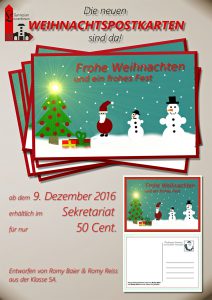 Ein besonders gelungenes Exemplar wurde schließlich ausgewählt und ist jetzt sogar als gedruckte Weihnachtspostkarte erhältlich. Die Karte wurde von Romy Baier und Romy Reiss aus der Klasse 5A gestaltet und ist für 50 Cent im Sekretariat des Laurentianums zu erwerben. Wer also zu Weihnachten einen besonders kreativen und persönlichen Gruß verschicken möchte, der findet hier die passende Postkarte.