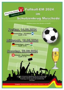 Müsche­de. Die Schüt­zen­bru­der­schaft St. Huber­tus Müsche­de weist schon jetzt dar­auf hin, dass sie die Vor­run­den­spie­le der Fuß­ball-EM mit deut­scher Betei­li­gung live in ihrer Ehren­amts­knei­pe „Schüt­zen­krug“ prä­sen­tie­ren wird.