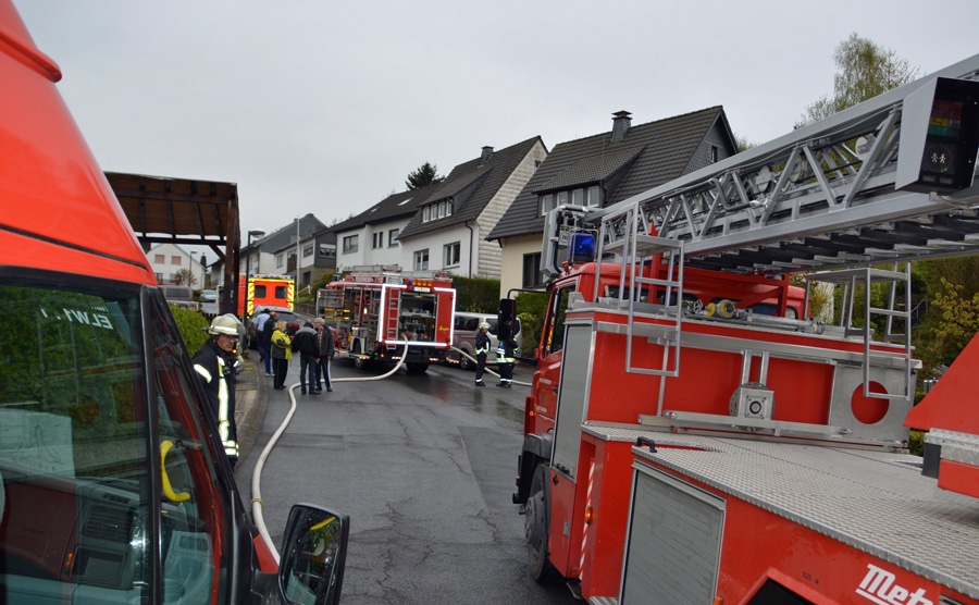 Beim Eintreffen von Feuerwehr und Rettungsdienst bestätigte sich diese Meldung. Aus dem Erdgeschoss des Wohnhauses waren Flammen und starker Brandrauch zu sehen. Die Eigentümer waren zum Zeitpunkt des Brandausbruchs nicht Zuhause. Ein Hund der Familie hielt sich jedoch noch im Haus auf. Ein Nachbar, der den Hund im Wohnzimmer liegen sah, schlug daraufhin die Terrassentür ein und rettete den leblosen Hund aus dem stark verrauchten Haus. Hierbei zog der Nachbar sich selbst eine Schnittverletzung an der Hand zu, die vom Rettungsdienst vor Ort versorgt wurde. Der Hund konnte durch den zwischenzeitlich eingetroffenen Hauseigentümer erfolgreich wiederbelebt werden.