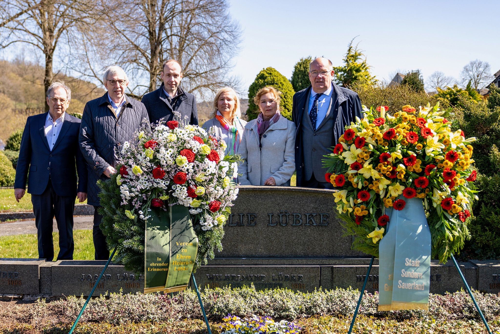 Zum Todes­tag von Hein­rich Lüb­ke leg­ten Ver­tre­ter der Stadt Sun­dern, des Ver­eins zum Geden­ken an Hein­rich Lüb­ke e.V. sowie Land­tags­ab­ge­ord­ne­ter Klaus Kai­ser am 6. April 2025 Krän­ze an des­sen Grab in Enkhausen nie­der, um sei­ne Ver­diens­te zu ehren. (Foto: Ver­ein zum Geden­ken an Hein­rich Lübke)