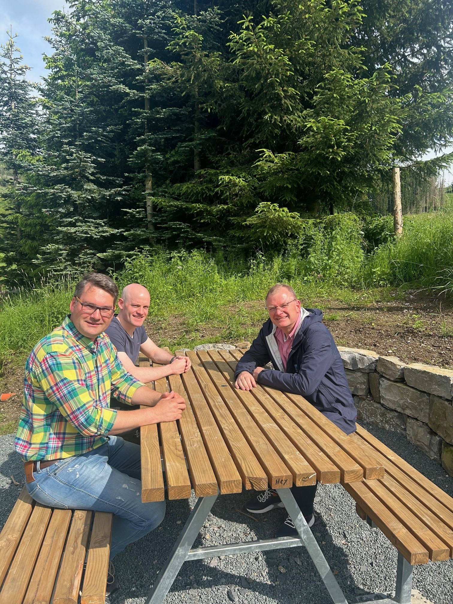 „Es ist uns ein besonderes Anliegen, neben der Schaffung einer intakten Infrastruktur auch die ehrenamtliche Tätigkeit der Vereinsmitglieder wertzuschätzen und zu unterstützen, um so auch kommende Generationen für das Ehrenamt zu motivieren“, so Naturpark Sauerland Rothaargebirge-Geschäftsführer Detlef Lins, der die Bank-Tisch-Kombination an den Ersten Vorsitzenden des Heimatvereins, Florian Clute und Schriftführer Matthias Vollmer übertrug.