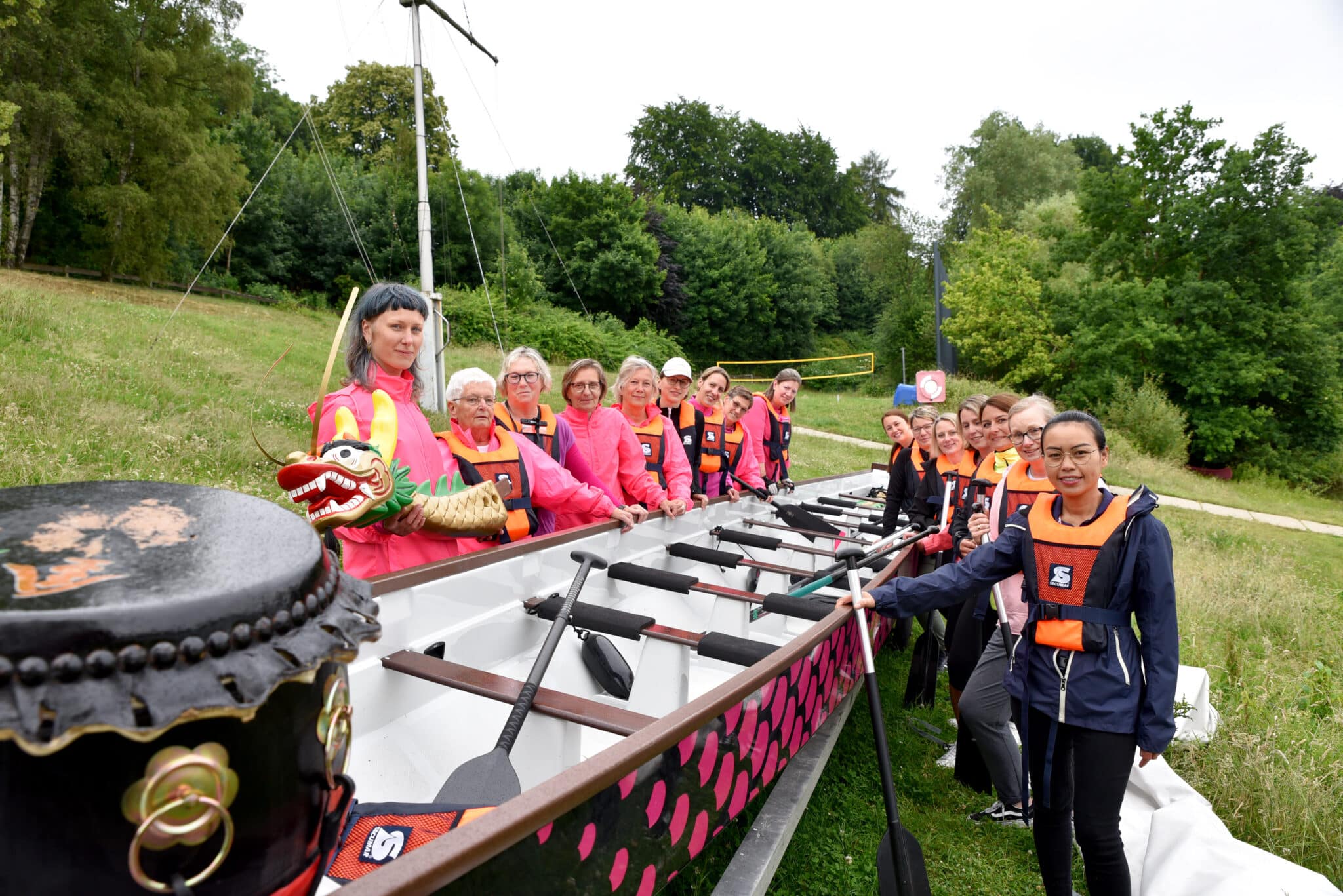 Die „Pinken Hennen“ – Pink ist als Farbe das Erkennungszeichen der an Brustkrebs erkrankten Frauen, die Hennen kommen vom Hennesee in Meschede – beschrieben beim Treffen wie sie sich gegründet haben. „Pink Paddeling ist eine weltweite Initiative, in Deutschland gibt es bereits über 40 Teams“, erzählt Karolina Dlugokecki, Mitglied der SHG beim Treffen am See. Im Januar 2024 hatten Frauen beschlossen, ihrer Erkrankung den Sport entgegenzustellen und das erste Treffen organisiert. Diesem, so Dlugokecki, seien Aufrufe zur Teilnahme auf verschiedenen gesellschaftlichen Kanälen gefolgt – mit Erfolg. Heute zählt die Gruppe über 30 Mitglieder und ist zu einer Unterabteilung des Ruderclubs Hennesee erwachsen. „Wir lagern hier auch unser Drachenboot, mit dem wir regelmäßig mindestens einmal in der Woche trainieren“, so das Gruppenmitglied. Nach einem Probepaddeln in Bochum stand der Entschluss fest, ein eigenes Boot zu erwerben. „Tilda“ – übersetzt „die Kämpferin“ – konnte nach einem erfolgreichen Crowdfunding mit einer heimischen Bank gekauft und vor einem Jahr getauft werden. Jetzt wird schon für die erste Regatta trainiert.