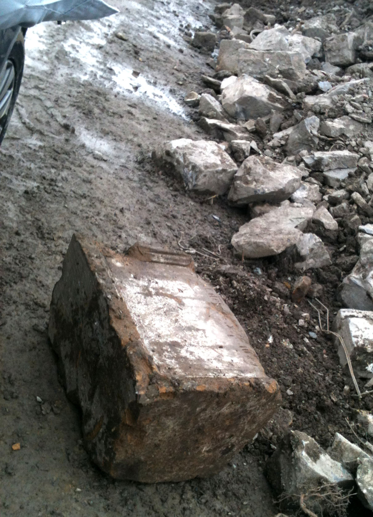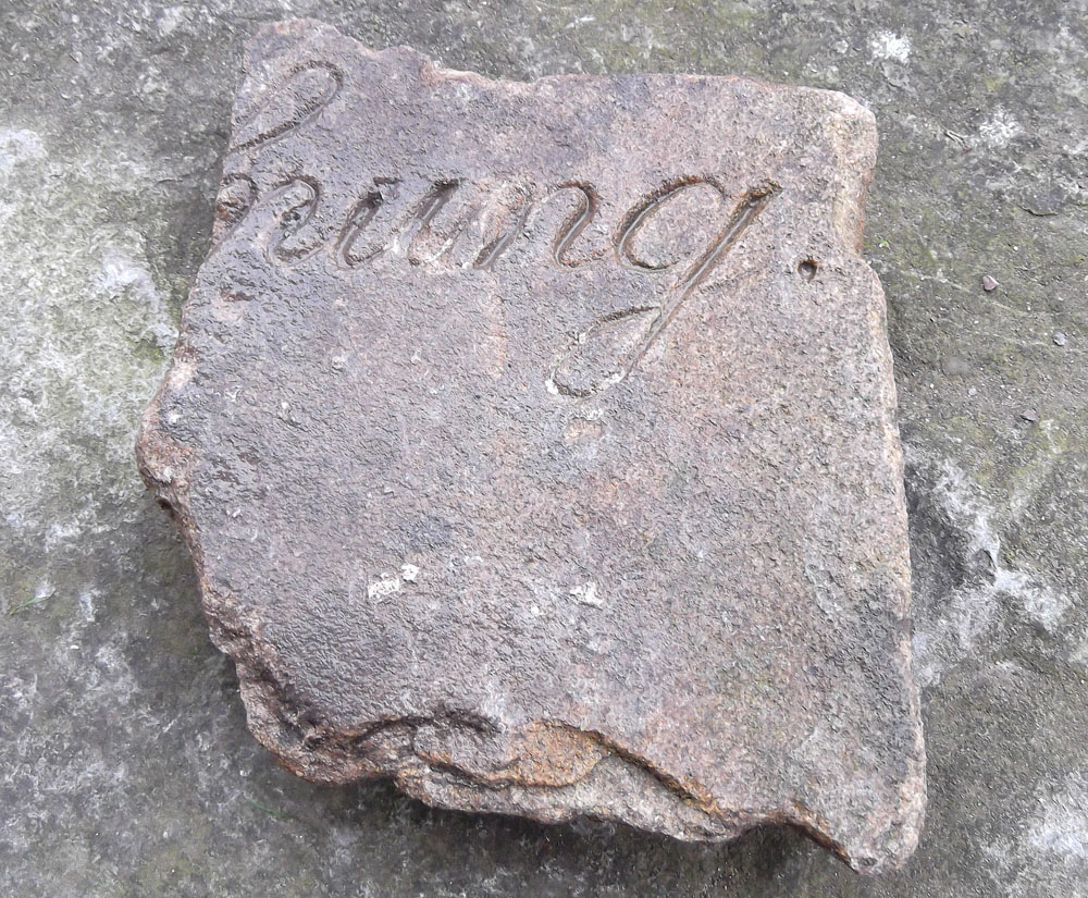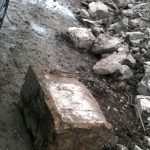 Ob unter dem Schot­ter wei­te­re Stei­ne zum Vor­schein kom­men wür­den, war unklar. Propst Bött­cher, der eben­falls an der Fund­stel­le ein­traf, und Chris­toph Regniet wand­ten sich dar­um an die zustän­di­ge Bau­fir­ma und arran­gier­ten auf der Lipp­städ­ter Depo­nie einen Ter­min, zu dem Archi­var Gos­mann, Küs­ter Win­fried Orth­mann und Susan­ne Ulm­ke die bereits abtrans­por­tier­ten Erd­mas­sen durch­su­chen konn­ten. Lei­der fan­den sich kei­ne Inschrif­ten­stei­ne mehr, obwohl man auch noch einen wei­te­ren Ter­min wahr­nahm, bei dem die Erd­mas­sen aus­ge­siebt wur­den, um das Mate­ri­al wei­ter zu ver­wer­ten. Ein­zig ein gewal­ti­ger Fun­da­ment­stein tauch­te aus den Geröll­mas­sen auf, der zu schwer zum Trans­port war und dar­um zurück­ge­las­sen wurde.