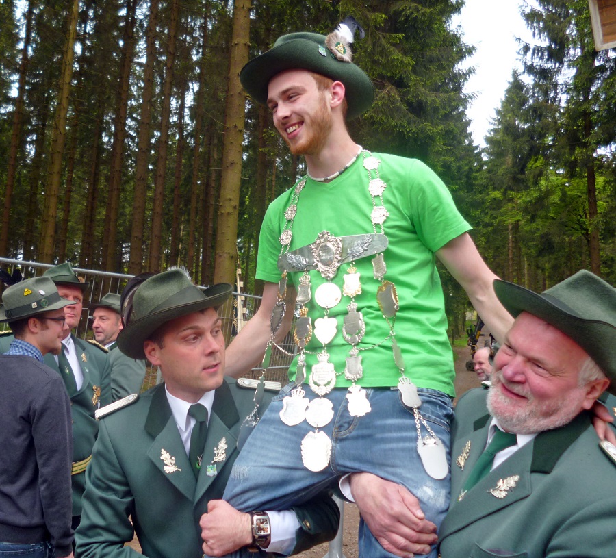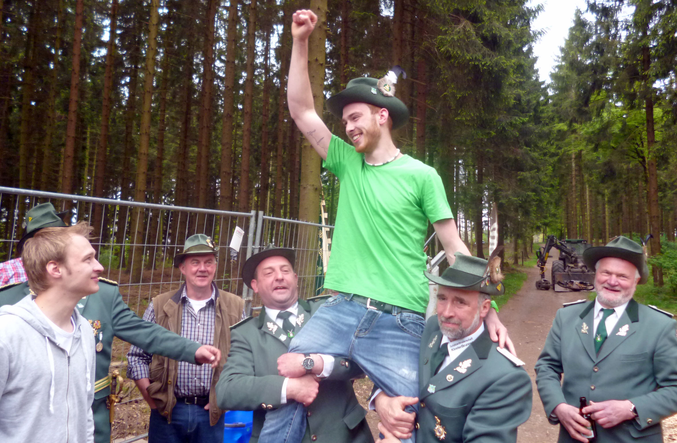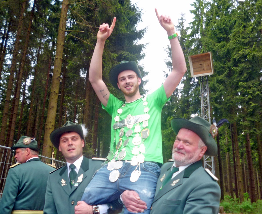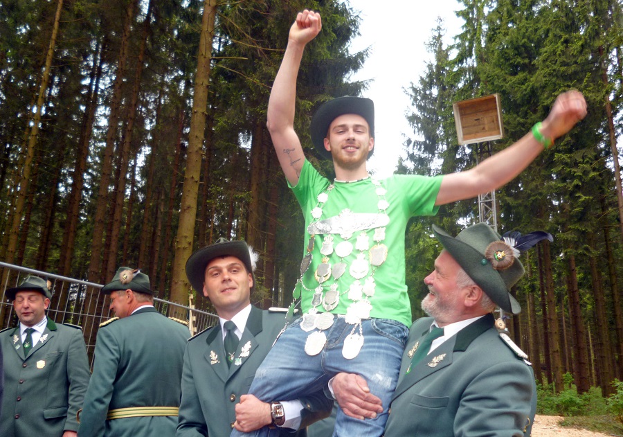 „Glückwunsch Kleiner!“ sagte Vater Norbert Osebold, der zu den ersten Gratulanten gehörte und an gleicher Stelle vor zehn Jahren Schützenkönig wurde. „Dass der Papa vor zehn Jahren König war,“ war ein Grund für den Youngster, erstmals unter die Stange zu gehen, aber auch, „dass es so geil ist hier oben“. Gregor Osebold, der im nächsten Monat seine Ausbildung als Schreiner beendet und in Recklinghausen wohnt, telefonierte gleich nach dem Königsschuss nach Allendorf. Dort wohnt seine Königin Linda Rickert.