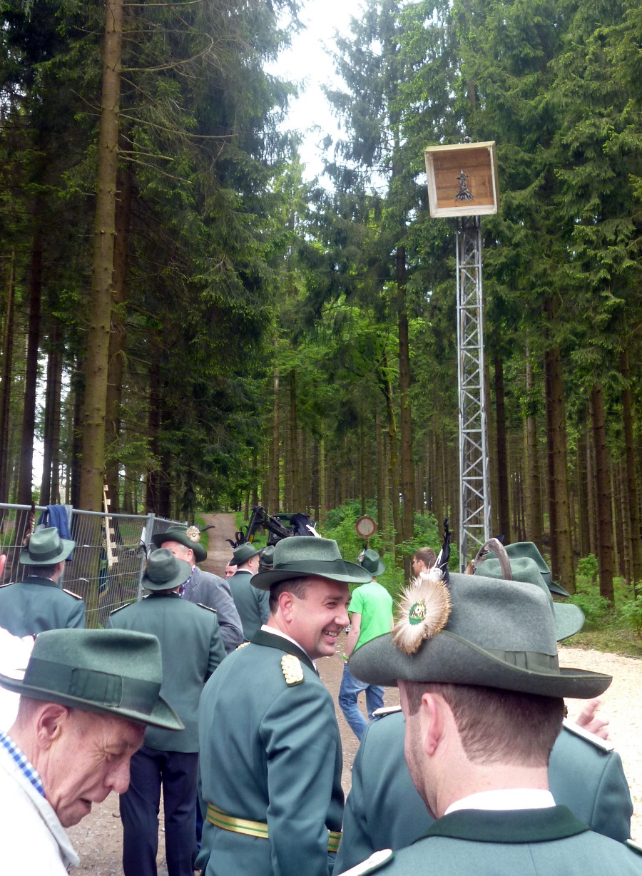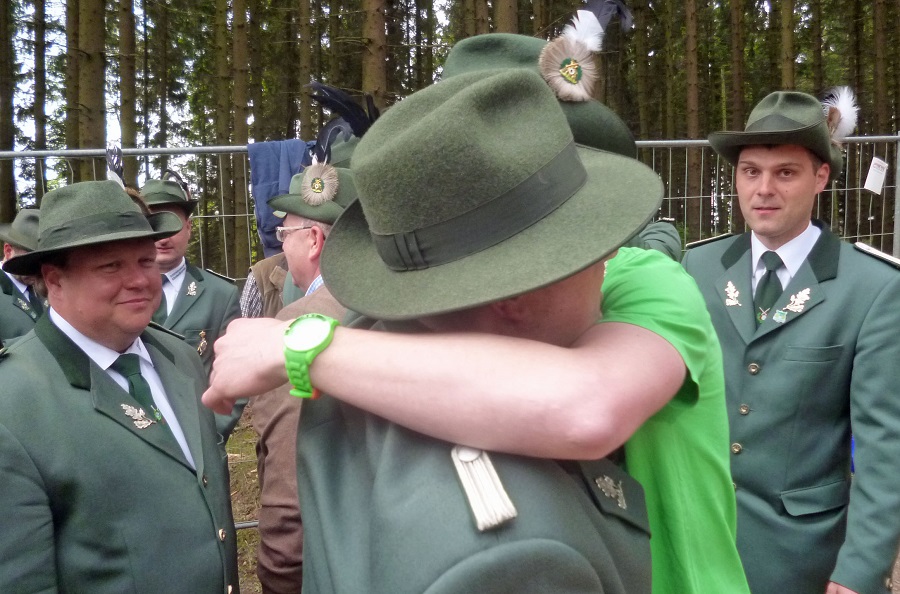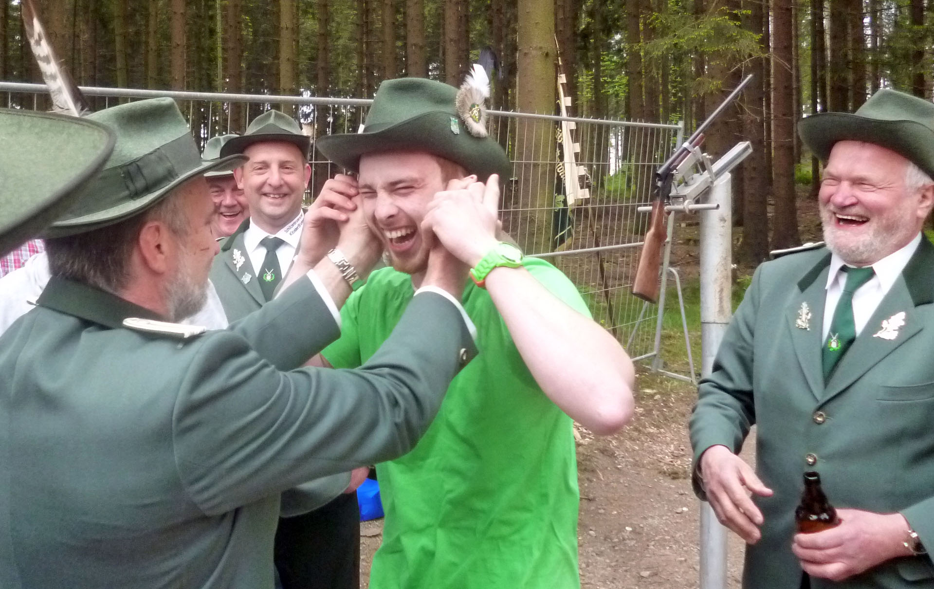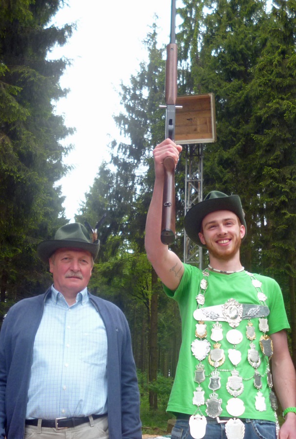 „Glückwunsch Kleiner!“ sagte Vater Norbert Osebold, der zu den ersten Gratulanten gehörte und an gleicher Stelle vor zehn Jahren Schützenkönig wurde. „Dass der Papa vor zehn Jahren König war,“ war ein Grund für den Youngster, erstmals unter die Stange zu gehen, aber auch, „dass es so geil ist hier oben“. Gregor Osebold, der im nächsten Monat seine Ausbildung als Schreiner beendet und in Recklinghausen wohnt, telefonierte gleich nach dem Königsschuss nach Allendorf. Dort wohnt seine Königin Linda Rickert.