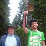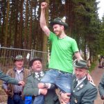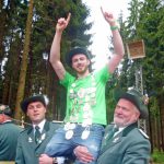 „Glück­wunsch Klei­ner!“ sag­te Vater Nor­bert Ose­bold, der zu den ers­ten Gra­tu­lan­ten gehör­te und an glei­cher Stel­le vor zehn Jah­ren Schüt­zen­kö­nig wur­de. „Dass der Papa vor zehn Jah­ren König war,“ war ein Grund für den Youngs­ter, erst­mals unter die Stan­ge zu gehen, aber auch, „dass es so geil ist hier oben“. Gre­gor Ose­bold, der im nächs­ten Monat sei­ne Aus­bil­dung als Schrei­ner been­det und in Reck­ling­hau­sen wohnt, tele­fo­nier­te gleich nach dem Königs­schuss nach Allen­dorf. Dort wohnt sei­ne Köni­gin Lin­da Rickert.
