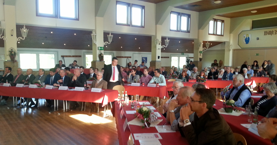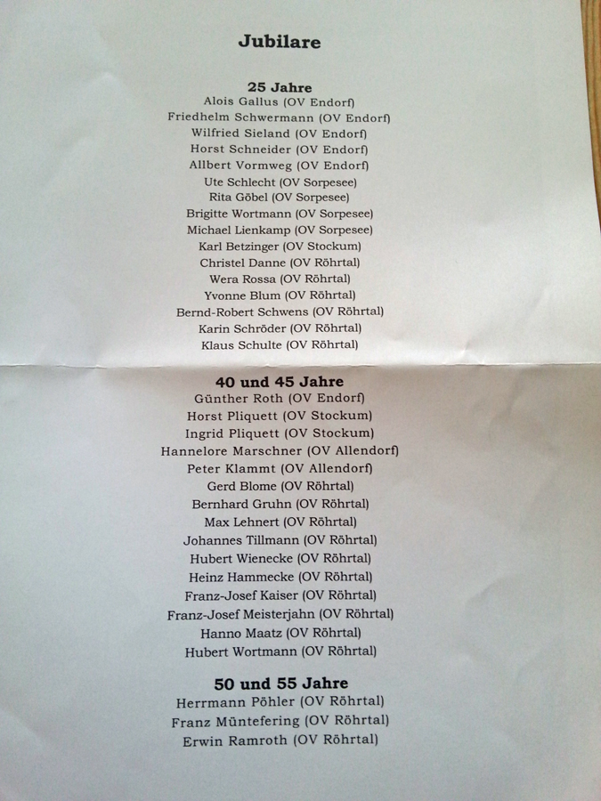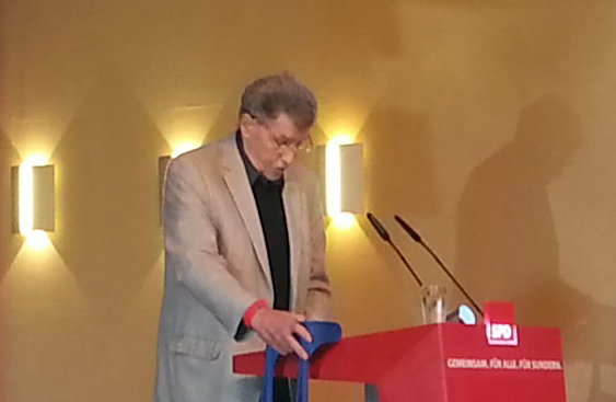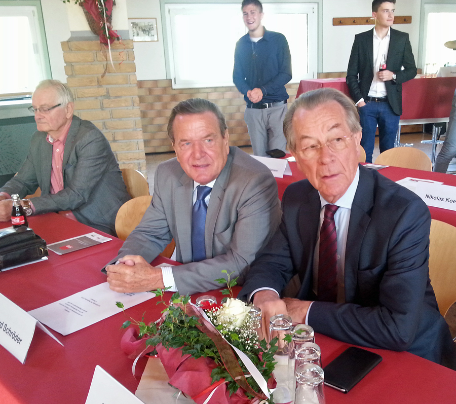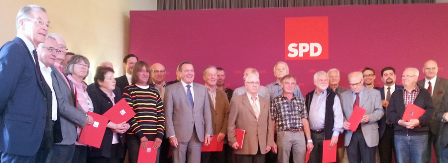 Gerhard Schröder, ging in seiner Laudatio auf die Jubilare besonders auf seine jahrelange Zusammenarbeit mit Franz Müntefering ein. „Auf Franz“, so Gerhard Schröder, „kann und konnte ich mich immer hundertprozentig verlassen. In den kräftezehrenden Jahren unserer gemeinsamen Arbeit zeichnete sich Franz Müntefering durch seinen Einsatz, seine Disziplin, seine prägende Kraft und durch ein besonderes Maß an positiver Sturheit aus. Franz Müntefering glaubt an die Gestaltbarkeit der Dinge.“ Auf die politische Entwicklung von Müntefering bezogen erinnerte er daran, dass Franz Müntefering über viele Jahrzehnte die Politik in Sundern, in Nordrhein-Westfalen und in der Bundesrepublik Deutschland mitgestaltet und geprägt hat. Den Jubilaren dankte Gerhard Schröder und erinnerte sie daran, dass sie Teil der Geschichte der SPD in Sundern seien und dass sie sich in Phasen der Bedrängnis und Herausforderungen immer für die Sozialdemokratie eingesetzt haben.