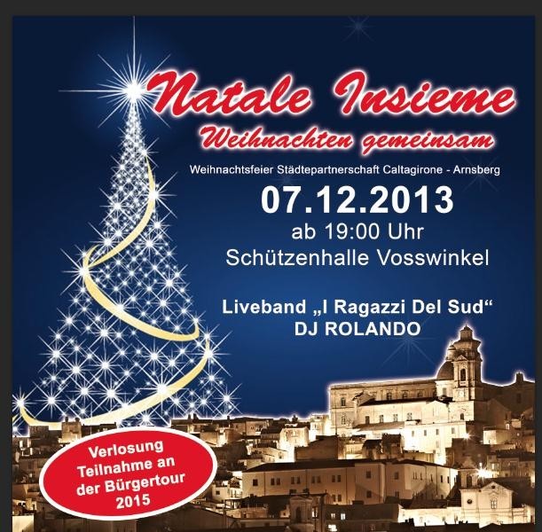 „Ob groß oder klein, jung oder alt – es ist für alles etwas dabei auf der Multikulti-Weihnachtsfeier“, so der Vorstand. Fröhlich wird auch die Lostrommel gerührt. Alle Besucher des Fests haben die Möglichkeit, sich als Hauptgewinner der Tombola den ersten Platz für die Bürgertour 2015 nach Sizilien zu sichern ‑mit freiem Flug und freier Unterkunft. Mehr zu der Reise wird am Samstagabend bekannt gegeben. Der Erlös der Tombola wird für die Förderung des ersten Schüleraustauschs zwischen Caltagirone und Arnsberg verwendet. Zusätzlich soll die Schulbibliothek in Caltagirone mit deutschem Lehrmaterial aufgestockt werden.