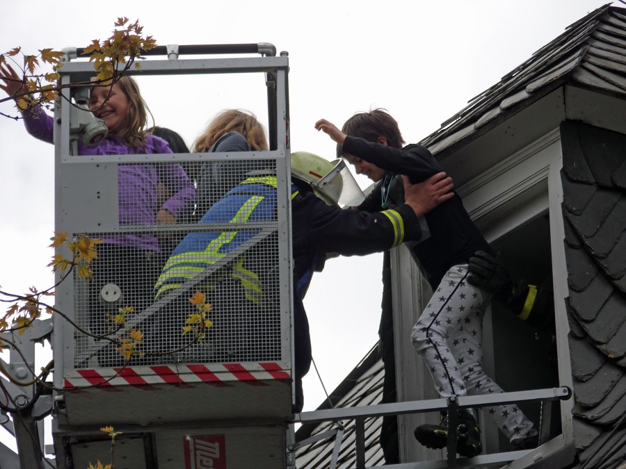 Beim Ein­tref­fen der Lösch­grup­pe Endorf an der Ein­satz­stel­le wur­de eine ers­te Lage­er­kun­dung durch­ge­führt. Hier­bei stell­te sich her­aus, dass bereits 27 Per­so­nen das Gebäu­de aus eige­ner Kraft ver­las­sen konn­ten. Sie­ben Kin­der und eine Betreue­rin wur­den jedoch ver­misst und nach Rück­spra­che mit den Betei­lig­ten im Ober- und Dach­ge­schoss des Gebäu­des ver­mu­tet. Umge­hend gin­gen meh­re­re Atem­schutz­trupps in das Gebäu­de, um nach den Ver­miss­ten zu suchen. In den Schlaf­un­ter­künf­ten im Ober­ge­schoss konn­ten drei Kin­der zügig auf­ge­fun­den und über das rauch­freie Trep­pen­haus in Sicher­heit gebracht wer­den. Eine Ret­tung der Per­so­nen aus dem Medi­ta­ti­ons­raum im Dach­ge­schoss, über das Trep­pen­haus, war zu die­sem Zeit­punkt auf­grund der Brand- und Rauch­aus­brei­tung nicht mehr mög­lich. Daher wur­de die Ret­tung über die zwi­schen­zeit­lich ein­ge­trof­fe­ne Dreh­lei­ter ein­ge­lei­tet. Nach kur­zer Zeit konn­ten so auch die Per­so­nen im Dach­ge­schoss geret­tet werden.