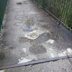 Hachen. Erneut wurde in der Stadtratssitzung am 12. November 2015 der schlechte bauliche Zustand der Fußgängerbrücke am Hachener Sportplatz kritisiert. Ratsmitglied Sebastian Rüßmann erinnerte die Verwaltung an die zugesagten Maßnahmen. Bereits im November 2014 hatten Mitglieder der SPD-Fraktion auf den miserablen Zustand des Bauwerkes hingewiesen und zu Protokoll gegeben, das von den Mängeln eine Gefährdung von Fußgängern nicht auszuschließen sei. Mittlerweile haben sich Betonabplatzungen und Schlaglöcher weiter vergrößert, die Stahlbetonbewährung liegt darüber hinaus in einigen Bereichen frei und ist der Witterung ausgesetzt.