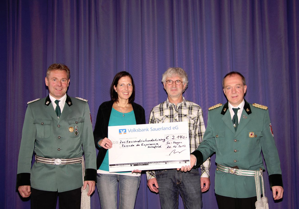 Beim Frühschoppen wurde auch die Spende der Hutsammlung vom Schützenfest-Montag überreicht. Michaela Fikus von der Fazenda da Esperança in Hellefeld nahm die Spende der Hagener entgegen und freute sich über den stattlichen Betrag von 2.140,00 Euro. Die Hagener hlebten damit beim Schützenfest den Leitsatz der Fazenda: „Wer Gemeinschaft lebt, erfährt Freude!“