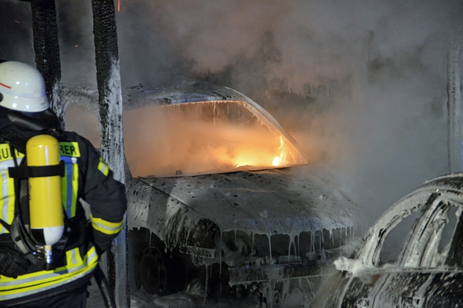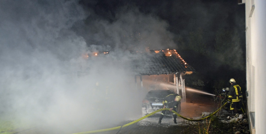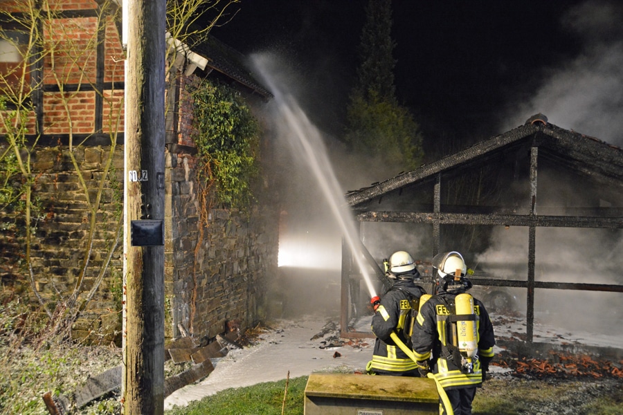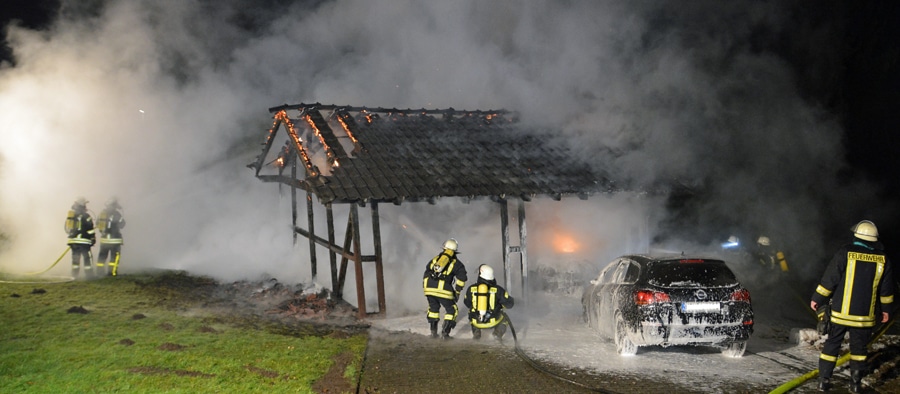 Nach einer kurzen Lageerkundung wurden umgehend erste Maßnahmen zur Brandbekämpfung eingeleitet. Im Carport selbst befand sich beim Eintreffen der Feuerwehr ein abgestelltes Fahrzeug. Dieses stand aber bereits im Vollbrand. Ein weiteres Fahrzeug, das vor dem Carport abgestellt war, brannte ebenfalls im vorderen Bereich. Da das Carport direkt an ein Nachbargebäude angrenzte, und das Feuer bereits auf den Dachstuhl übergegriffen hatte, wurde zusätzlich zur Brandbekämpfung eine Riegelstellung zu diesem Gebäude aufgebaut. So konnte ein weiteres Übergreifen verhindert werden. Zeitgleich wurde auf Anforderung des Einsatzleiters Vollalarm für den Löschzug Sundern ausgelöst, da weitere Atemschutzträger an der Einsatzstelle benötigt wurden. Nach rund einer halben Stunde entspannte sich die Einsatzlage aber zusehends. Das an das Carport angrenzende Gebäude konnte durch die eingeleiteten Maßnahmen erfolgreich gehalten werden. Der Schaden an diesem Gebäude ist somit relativ gering. Das Carport selbst und die zwei betroffenen Fahrzeuge brannten vollständig aus.
