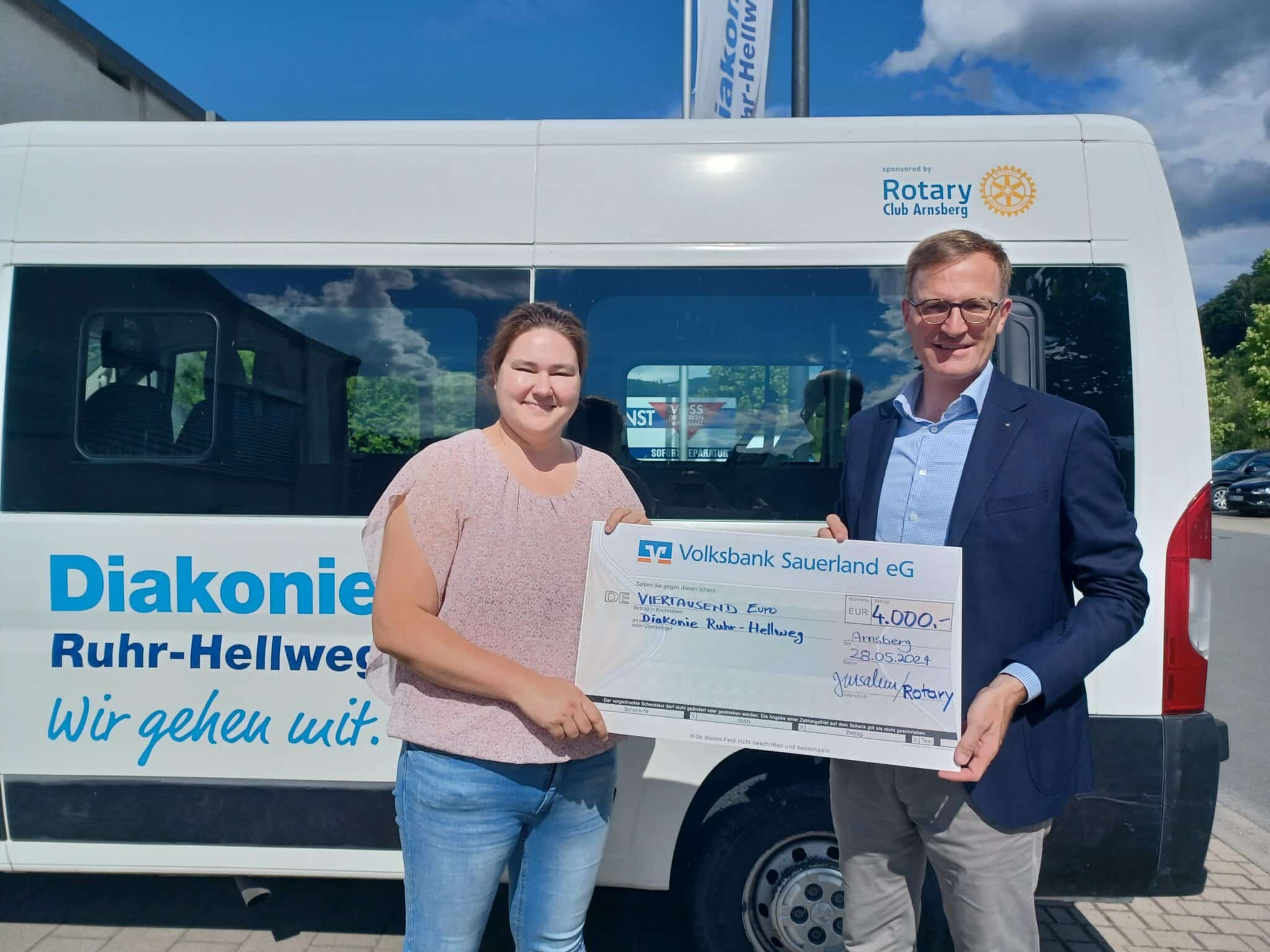 Der Rotary Club Arnsberg unterstützt die Beratungsstelle der Diakonie mit Sitz hinter dem Arnsberger Bahnhof schon viele Jahre. Im Frühjahr 2020 wurde bereits ein Bulli gespendet. Den nutzt das Team der Beratungsstelle zum Beispiel für Umzüge der Klientinnen und Klienten oder um Möbel bei Wohnungsauflösungen abzuholen und zu Menschen zu bringen, die diese dringend brauchen. Darüber hinaus spendeten die Rotarier im Jahr 2021 10.000 Euro für den Notfallfond, und nun konnten erneut 4.000 Euro aufgebracht werden. Für Philipp Jerusalem, Präsident des Rotary Club Arnsberg 2023–2024, ist das Engagement eine Herzensangelegenheit und ein wichtiges Zeichen: „Die Beratungsstelle der Diakonie leistet wichtige Arbeit für Arnsberger, die in große Schwierigkeiten geraten sind. Ich freue mich, dass wir – der Rotary Club Arnsberg – der Beratungsstelle erneut helfen können. Unser besonderer Dank gilt allen Spendern, die unsere Unterstützung ermöglicht haben.“