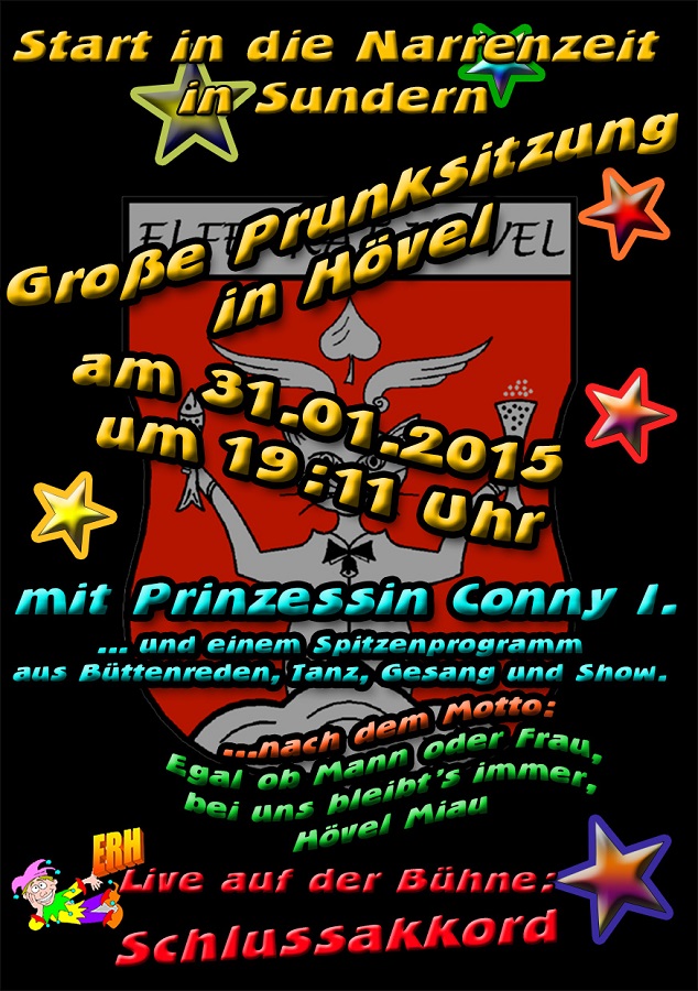 Nach dem diesjährigen Motto „Egal ob Mann oder Frau, bei uns bleibt’s immer ‚Hövel Miau‘“ wird ein abwechslungsreiches Programm mit Bütt, Tanz und diversen Überraschungen geboten. Neben den bekannten einheimischen Akteuren freut man sich dieses Jahr auch auf Überraschungsgäste aus der näheren Umgebung. „Insbesondere freuen wir uns auf den altbewährten Büttenredner Werner Flügge, dem Ehemann der amtierenden Karnevalsprinzessin, und den Celebrations, der Showtanzgruppe, der auch die Prinzessin Conny I. angehört,“ so Markus Allefeld. „Selbstverständlich sind auch für die Dorfchronik wieder einige Kuriositäten aufbereitet und mit kleinen Videofilmchen dokumentiert worden.“