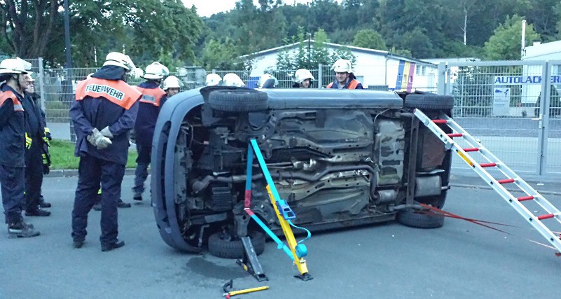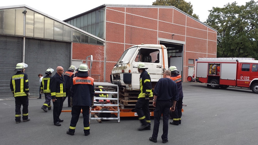 Schu­lungs­ge­gen­stand der ers­ten Sta­ti­on war die  Erst­ver­sor­gung eines Pati­en­ten durch das Ret­tungs­dienst-Per­so­nal im Ret­tungs­wa­gen. Die Feu­er­wehr­kräf­te erlang­ten hier einen auf­schluss­rei­chen Ein­blick in einen Bereich, der ihnen in einem Real-Ein­satz im Regel­fall nicht zugäng­lich ist. Im Rah­men der zwei­ten Übungs­sta­ti­on wur­de das Abstüt­zen eines Unfall-Pkw geübt. Das beson­de­re Augen­merk lag hier auf der Siche­rung eines auf der Sei­te lie­gen­den Fahr­zeugs mit­tels Steck­lei­ter­tei­len und mit einem spe­zi­el­len Abstütz- und Siche­rungs­sys­tem. Die Absol­ven­ten der drit­ten Aus­bil­dungs­sta­ti­on erwar­ben prak­ti­sche Grund­la­gen­kennt­nis­se für tech­ni­sche Hil­fe­leis­tun­gen an einem Lkw. Hier­bei kamen hydrau­li­sche Ret­tungs­ge­rä­te und eine sog. Ret­tungs­platt­form zum Einsatz.