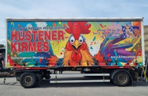 Ein besonderes Augenmerk liegt dabei auf dem neuen Schaubüro, dem organisatorischen Herzstück der Veranstaltung. Das alte Schaubüro, das über viele Jahre hinweg seinen Dienst geleistet hat, musste aufwendig zum „Alten Friedhof“ gebracht werden und ist nun durch eine neue Wechselbrücke (LKW-Anhänger) ersetzt worden. Dieser LKW-Anhänger bietet nicht nur mehr Platz und Komfort für das Team, sondern ist auch ein echter Hingucker: Auf der großflächigen Plane prangt ein bunter Kirmeshahn, der für die Tierschau und die gesamte Kirmes wirbt.