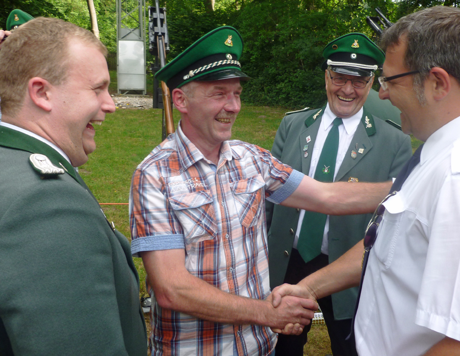 „Will noch wer?“ fragte der Vorstand um 9.45 Uhr in die Runde, doch allen anderen, die vorher mitgeschossen hatten, war die Angelegenheit da schon zu heiß geworden. Antonius Feische, der voriges Jahr unter der Vogelstange schon geübt hatte und sich von seinem Bruder Thomas, der schon König war, coachen ließ, zog es durch. Um 9.55 Uhr fiel der Vogel im 123. Schuß.