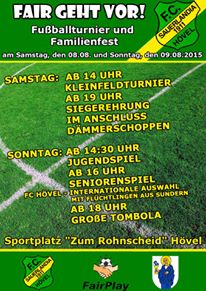 2015.08.06.Sundern.FCHövelAb 14 Uhr tre­ten die Teams am Sams­tag, 8. August auf zwei Klein­feld­plät­zen des Sport­plat­zes am Rohn­scheid gegen­ein­an­der an. Im Anschluss an die Sie­ger­eh­rung gegen 19 Uhr ist ein gemüt­li­cher Däm­mer­schop­pen bei net­ten Gesprä­chen mit kuli­na­ri­schen Köst­lich­kei­ten auf dem Sport­platz­ge­län­de geplant, zu dem jeder ein­ge­la­den ist mit­zu­fei­ern. Am Sonn­tag fin­det um 16 Uhr ein Fuß­ball­spiel der Senio­ren­mann­schaft des FC Sau­er­land­ia gegen eine gemisch­te Mann­schaft aus Sun­dern statt, in der auch Flücht­lin­ge aus dem Stadt­ge­biet aktiv sind.