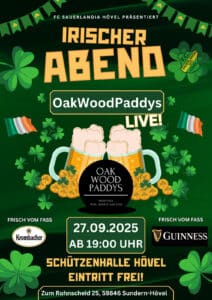 Sundern/Hövel. Im Rah­men sei­nes Grün-Gel­ben Ver­eins­fests lädt der FC Sau­er­land­ia Hövel am Sams­tag, 27. Sep­tem­ber 2025, zu einem „Iri­schen Abend“ in die Schüt­zen­hal­le Hövel ein. Beginn ist um 19 Uhr, der Ein­tritt ist frei.