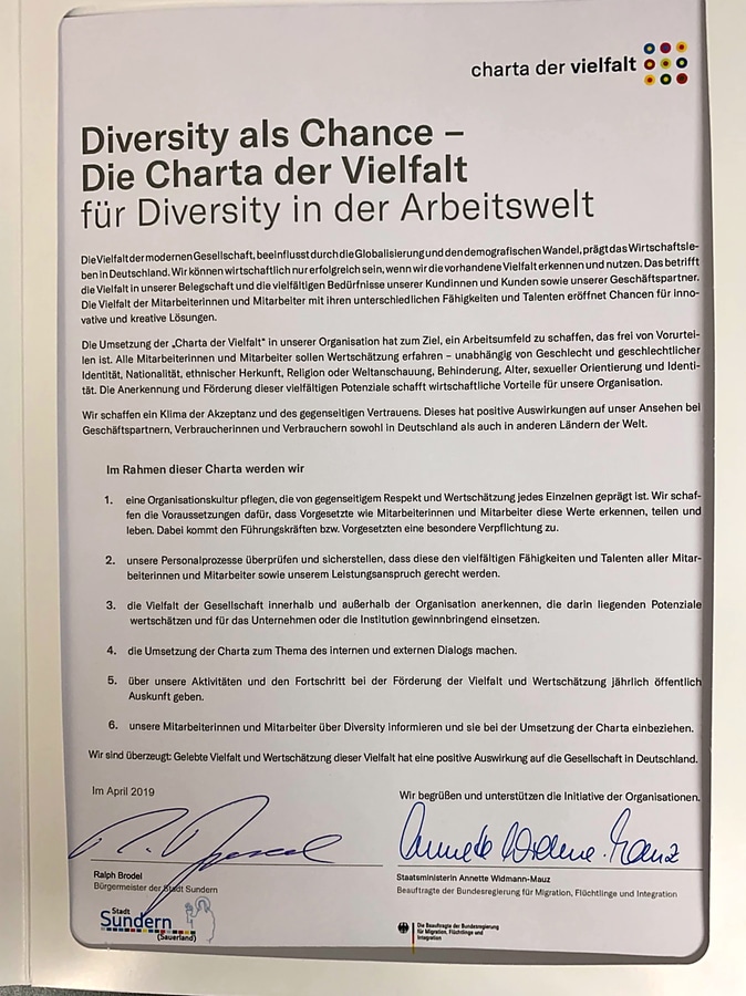 der Charta durch Bürgermeister Brodel ein mehr als nur gutes Zeichen: „Macht dies doch deutlich, dass die Stadtverwaltung Sundern es sich zur Aufgabe macht, Werte wie Chancengleichheit und