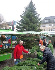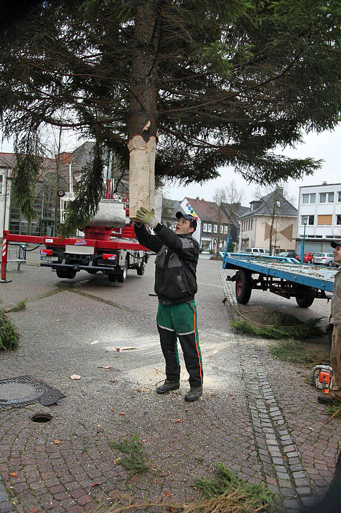 Bereits seit über einer Woche steht eine zehn Meter hohe Edeltanne mitten auf dem Neheimer Markt. Schützen, Jäger und Aktives Neheim hatten den Baum in einer gemeinsamen Aktion am Müggenberg gefällt, in die City transportiert und aufgestellt.