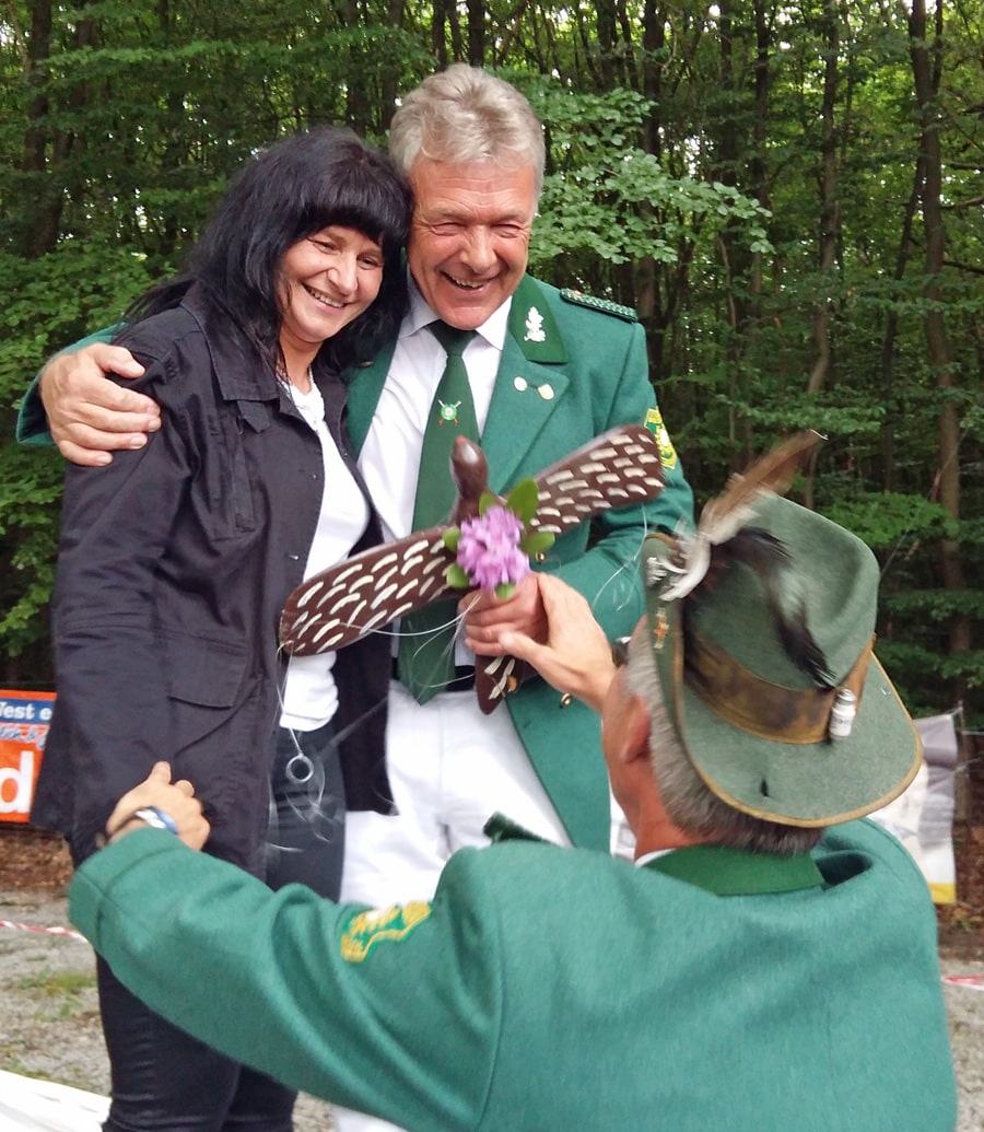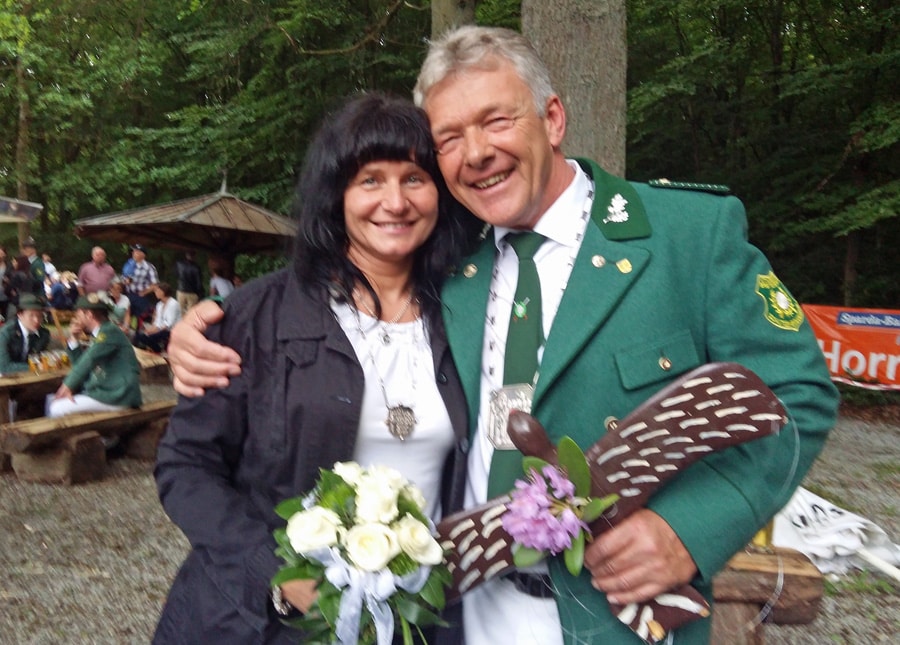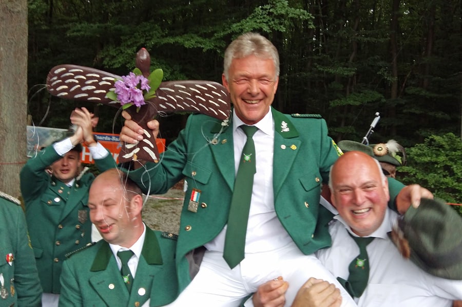 Der neue König kommt zwar aus Brei­ten­bruch, kennt aber, wie er erzählt, die Jungs in Brei­ten­bruch seit gemein­sa­men Kin­der­ta­gen und ist den Schüt­zen und dem Fest eng ver­bun­den. Schon mehr­fach hat­te er über die Jah­re auch auf den Vogel geschos­sen. Dies­mal ist es end­lich gelun­gen. Nach­dem das schei­den­de Königs­paar Jens und Nan­na Kipar ihren Nach­fol­gern die Königs­ket­ten über­ge­ben hat­ten, wur­de noch in vie­len Stro­phen das Brei­ten­bruch­er Schüt­zen­lied intoniert.