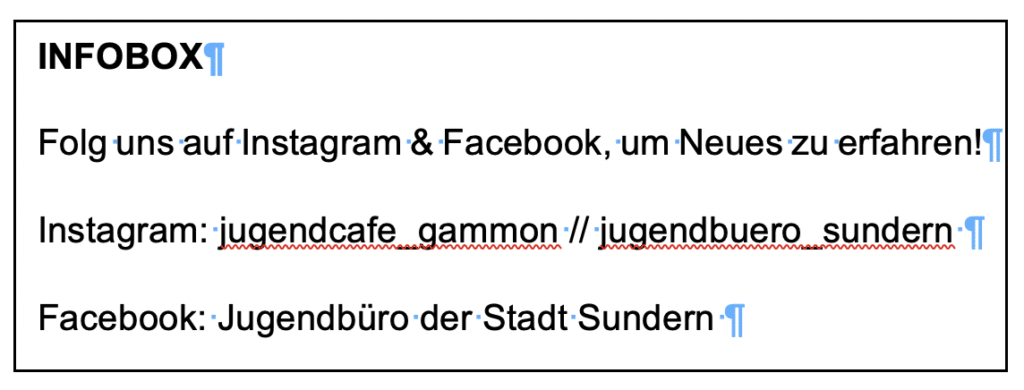 Eine digitale Vernetzung des Teams ermöglicht weiterhin den Austausch. Viele kreative digitale Aktionen und Projekte sind bereits entstanden. Jeder Tag bringt eine neue Überraschung. Wer interessiert ist, kann dem Jugendcafé Gammon und dem Jugendbüro der Stadt Sundern auf den sozialen Medien folgen. Dort werden die digitalen Aktionen, kleine Spiele über die App Houseparty und Discord Öffnungszeiten Zeiten publiziert. Bei Instagram gibt es zudem den Einladungslink für Discord.