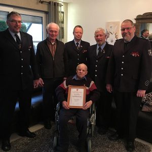 Neben einem Geschenk gab es für Karl Marczewski auch eine nicht alltägliche Ehrung vom Landesfeuerwehrverband. Löschgruppenführer Martin Henneke hatte die Ehre, die Sonderauszeichnung in Gold in Form einer Anstecknadel und einer Ehrenurkunde zu überreichen. Der Jubilar, der im Kreise seiner Familie feierte, freute sich sehr über die Ehrung und die Gratulationen.