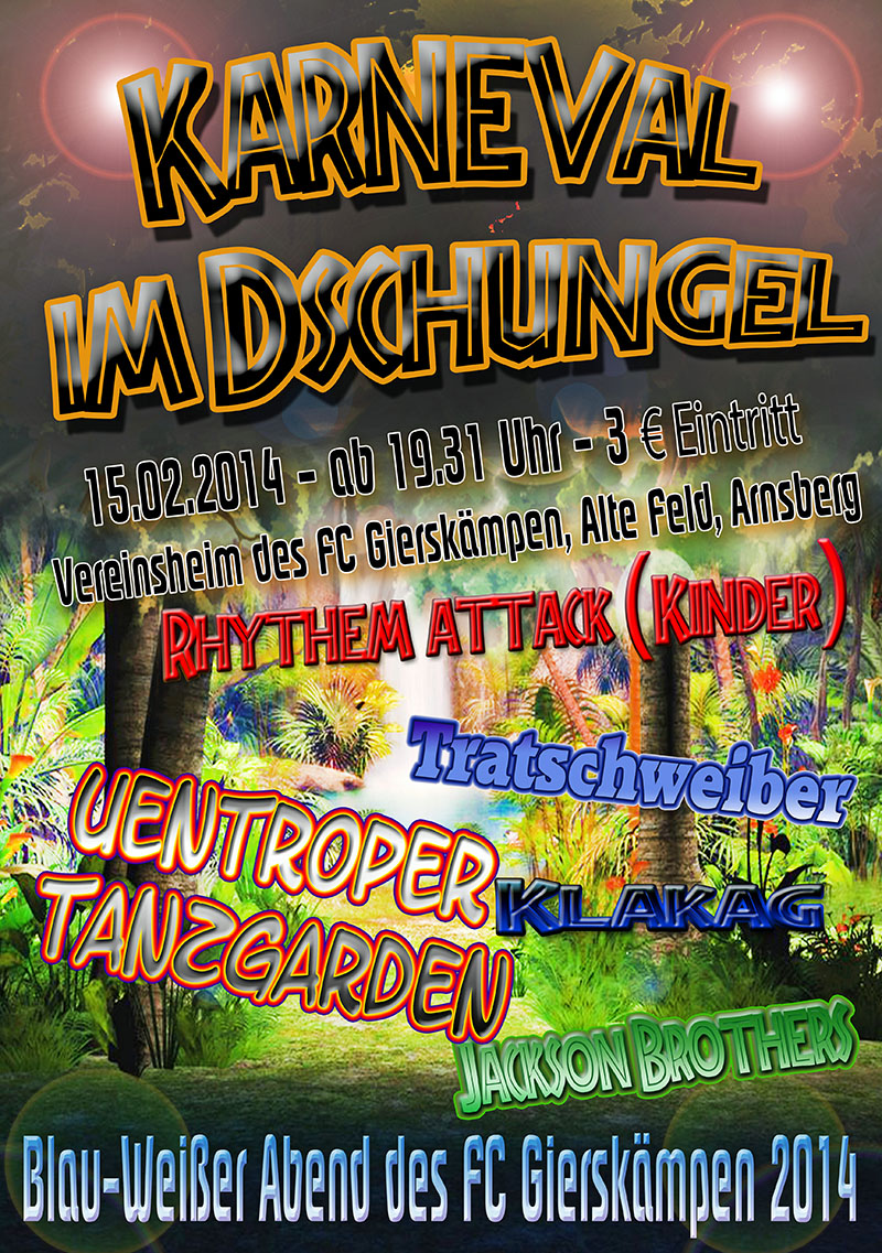 Arnsberg. Der Blau-Weiße Abend des FC Gierskämpen findet dieses Jahr unter dem Motto „Karneval im Dschungel“ statt. Die Vorfreude ist riesig, die Arbeit noch viel riesiger. Aber der Spaß wird mal wieder alles toppen. Karneval im Dschungel heißt es am Samstag, 15. Februar ab 19.31 Uhr im Vereinsheim des FC Gierskämpen. Eingeladen sind natürlich alle Karnevalsfreunde. Gegen 3 Euro Dschungelgebühr geben sich die Uentroper Tanzgarden die Ehre, die Jackson Brothers und die bekannte Kindergruppe Rhythem Attack werden allen Gästen mächtig einheizen. Die KLAKAG wird ebenfalls mit einer großen Abordnung erwartet. Weitere Karnevalisten versüssen den Abend. Der FCG, die Organisatoren und der Vorstand freut sich auf viele Gäste aus nah und fern.